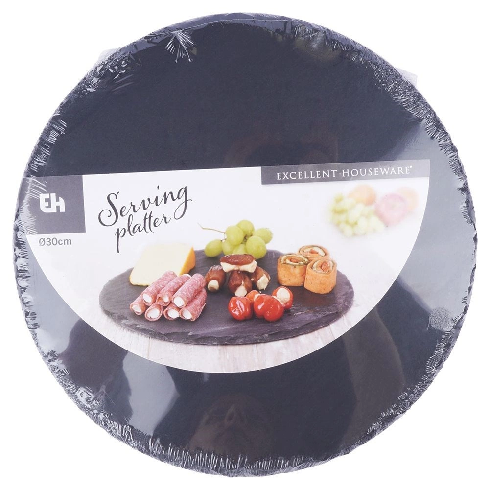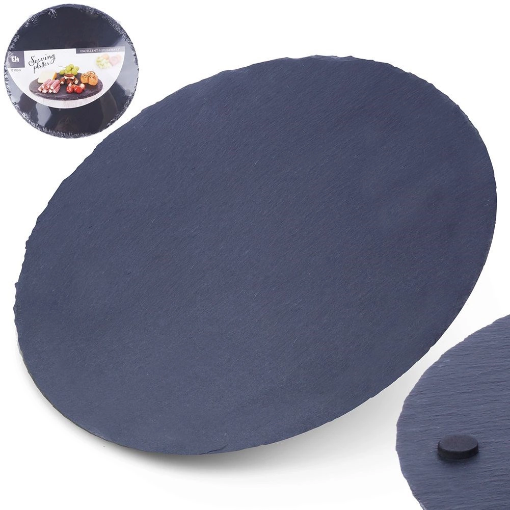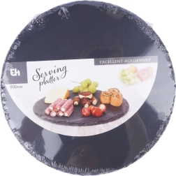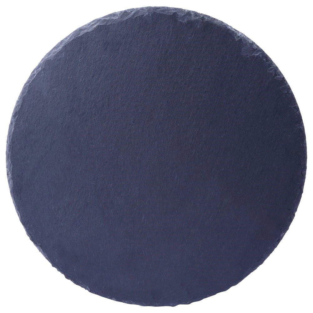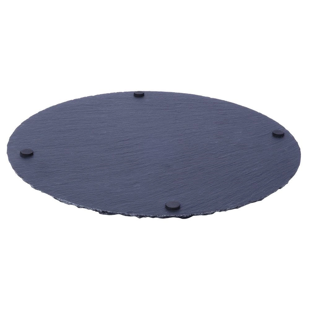 Tavă rotundă elegantă din ardezie naturală, cu diametrul de 30 cm, pentru servire cu stil. Oferă un aspect rustic, suprafață solidă din piatră și utilizare universală pentru brânzeturi, aperitive, deserturi și preparate fierbinți. Datorită tampoanelor antiderapante este stabilă și sigură pe orice masă.