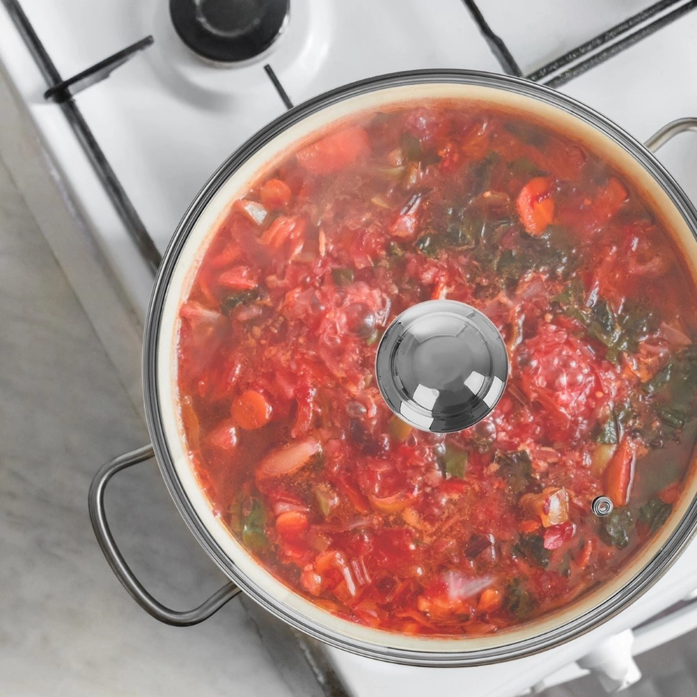 Orificiul integrat de aerisire evacuează aburul în exces, reducând riscul de supra-fierbere. Mânerul metalic ergonomic oferă o prindere bună, iar marginea ajută la prevenirea alunecării de pe vas și la etanșarea fermă. Ideal în orice bucătărie pentru gătire mai rapidă și mai curată.