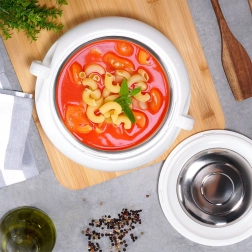 Construcția dublă cu inserție din inox păstrează mâncarea caldă sau rece mai mult timp – ideală pentru servirea supelor și a deserturilor.