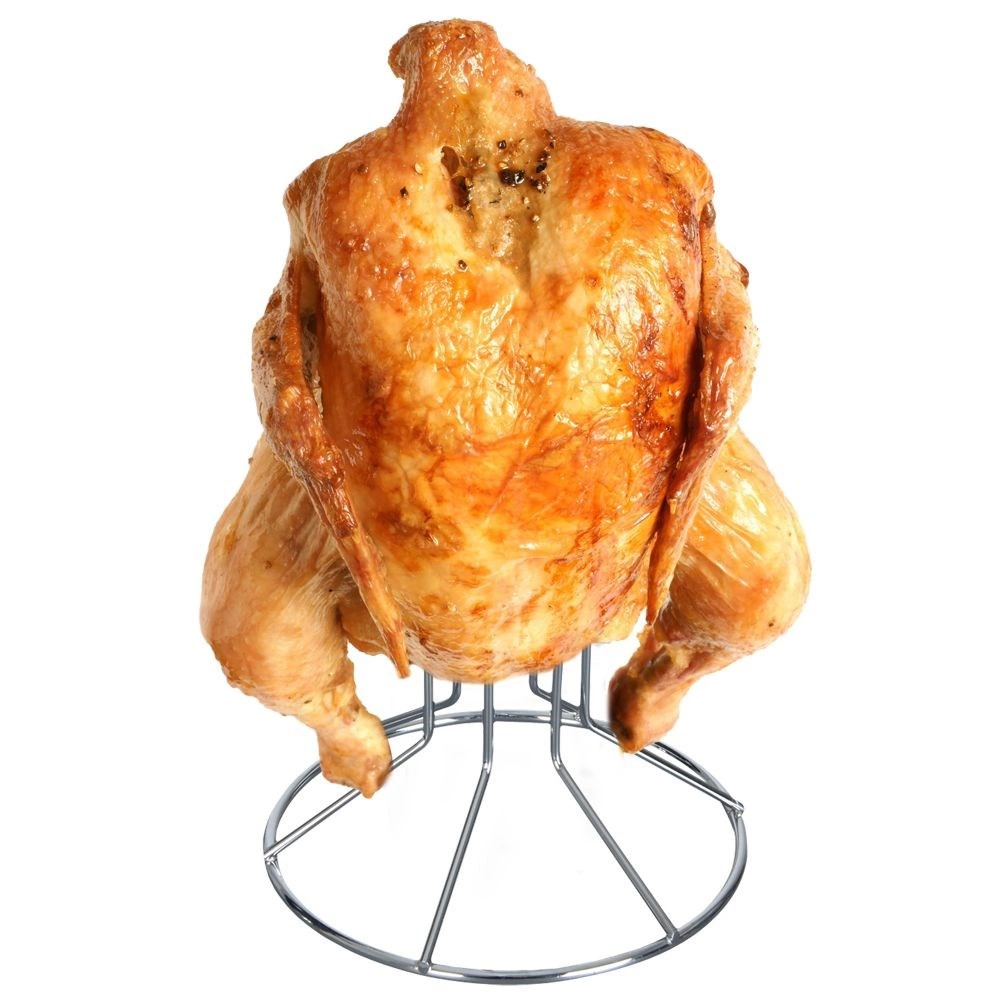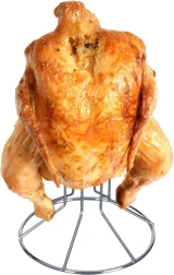 Suportul practic pentru coacerea puiului asigură o gătire uniformă și o piele frumos crocantă. Datorită poziției verticale, carnea nu stă în grăsime, fiind astfel mai sănătoasă, succoasă în interior și crocantă la exterior. Construcția robustă din sârmă cromată și baza stabilă facilitează utilizarea în siguranță în orice bucătărie.