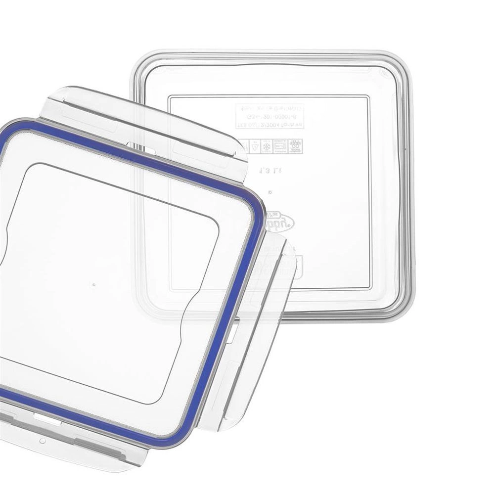 Cutia pătrată practică (10 × 10 × 6 cm) din plastic transparent de calitate îți păstrează alimentele mai mult timp proaspete datorită garniturii din silicon și celor patru cleme de închidere. Perfectă pentru utilizare zilnică acasă, la birou și în călătorii – fără grija scurgerilor.
