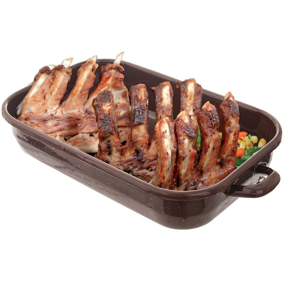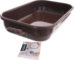 Această tavă dreptunghiulară rezistentă, din oțel de calitate cu suprafață emailată, este excelentă pentru gătitul zilnic și pentru coacerea de sărbători. Emailul este sigur pentru sănătate și potrivit și pentru persoane alergice. Dimensiunile exterioare 34 × 18,5 × 6,5 cm și cele interioare 26 × 16 × 6 cm oferă suficient spațiu pentru prepararea unei game variate de feluri.