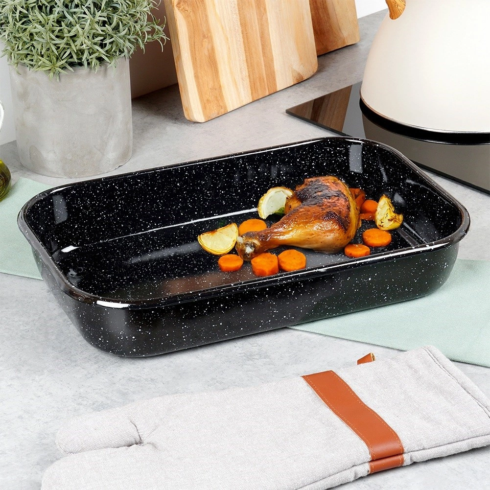 Tava dreptunghiulară din oțel emailat este rezistentă, igienică și conduce excelent căldura pentru o coacere uniformă. Emailul este sigur pentru sănătate și potrivit și pentru alergici. Datorită dimensiunilor universale 38 × 24,5 × 7 cm (interior 36 × 22,5 × 6 cm) este potrivită pentru coacerea cărnii, legumelor, sufleurilor și deserturilor.