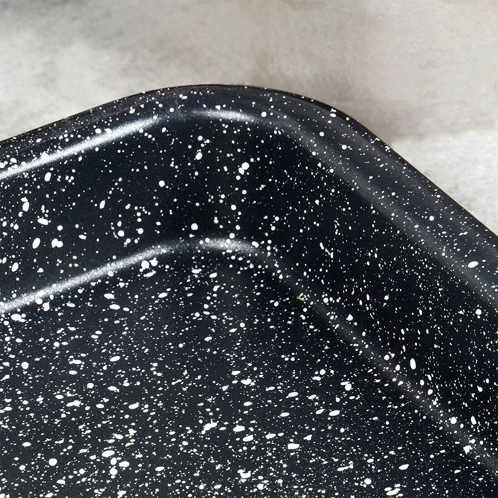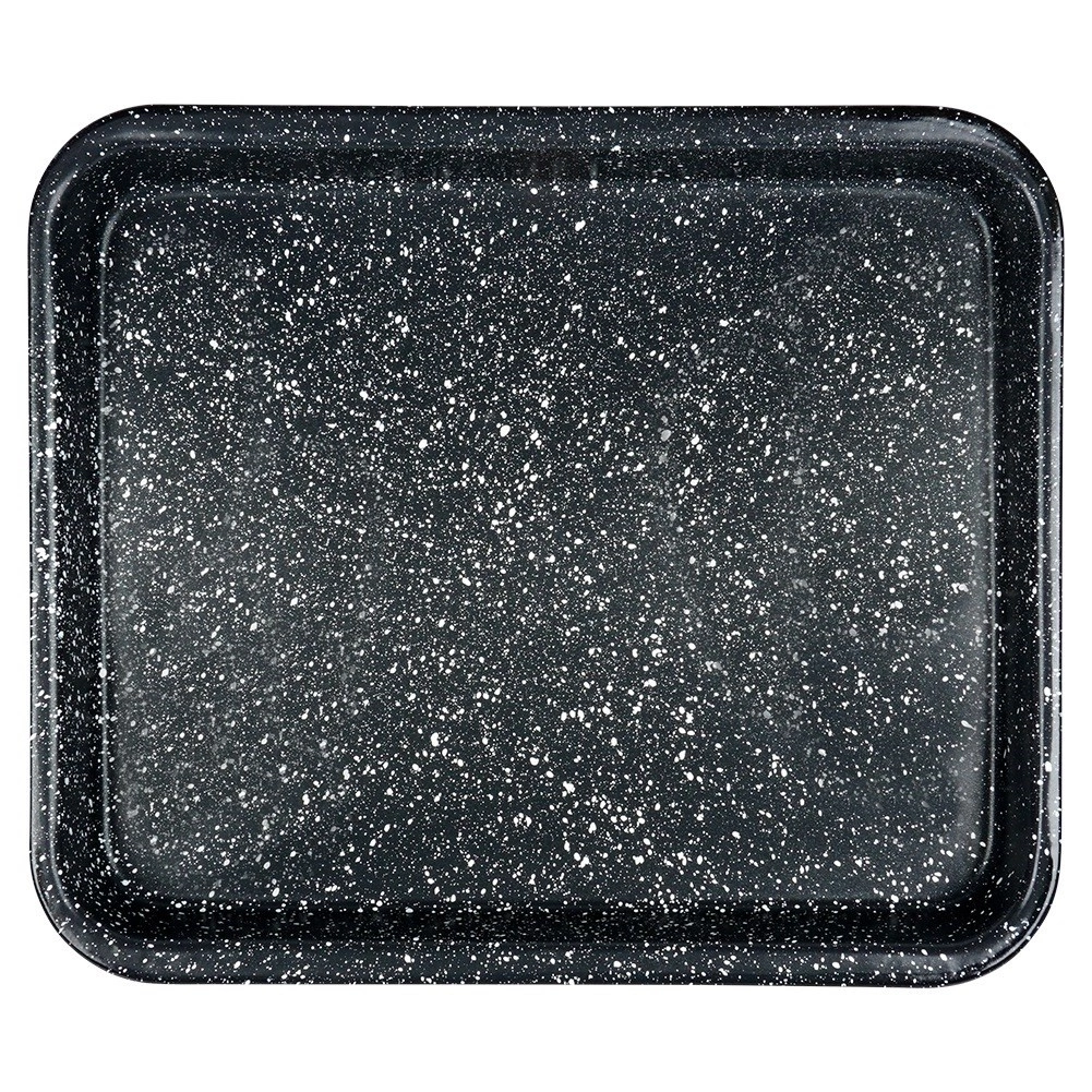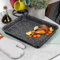 Tava universală cu margini înalte asigură coacere uniformă și manipulare comodă. Stratul interior antiaderent din granit minimizează lipirea chiar și cu o cantitate mică de grăsime și este rezistent la zgârieturi. Metalul emailat, într-o elegantă culoare neagră, este rezistent și își păstrează forma pe termen lung.