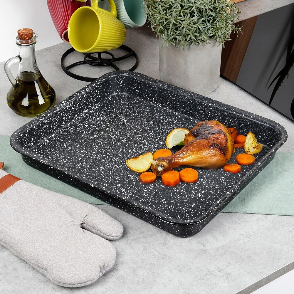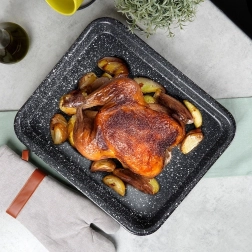 Marginile înalte și conductivitatea termică uniformă sunt excelente pentru fripturi suculente, cartofi sau preparate gratinate.