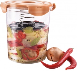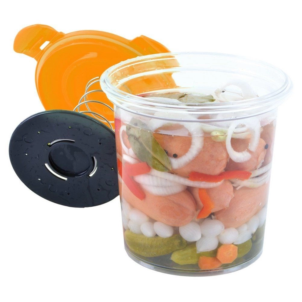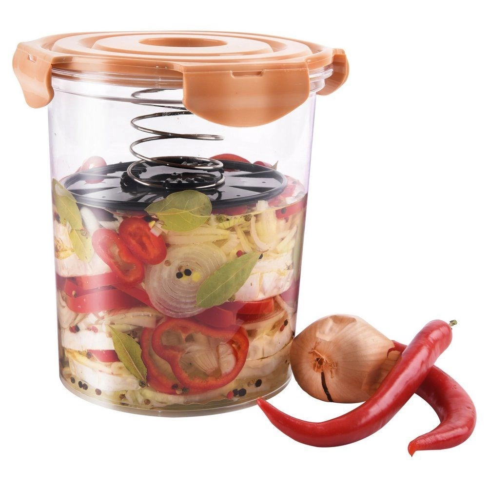 Corpul clar al recipientului permite verificarea rapidă a stadiului de marinare sau fermentare fără a deschide capacul.