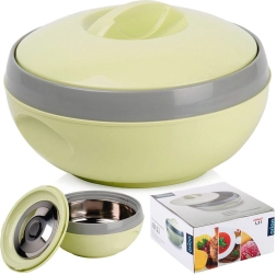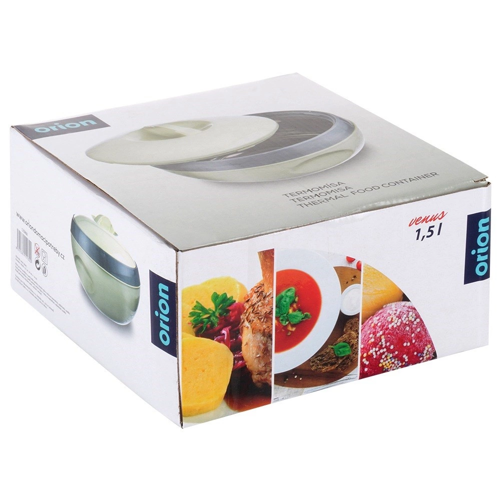 Practică termocaserolă cu volum de 1,5 l (volum util 1,3 l) care menține preparatele calde până la 2 ore sau, dimpotrivă, reci pentru mai mult timp. Are o construcție rezistentă cu inserție din oțel inoxidabil, închidere cu filet ușoară și capac cu mâner comod pentru transport. Ideală pentru prânzuri, garnituri și înghețată. Produs original marca ORION.