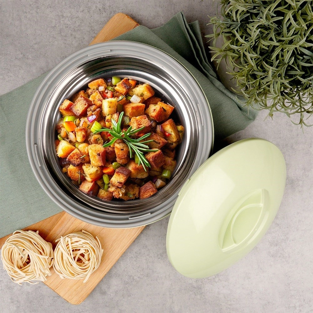 Bolul interior din inox și învelișul din plastic rețin eficient căldura până la 2 ore sau ajută la păstrarea preparatelor reci proaspete mai mult timp.
