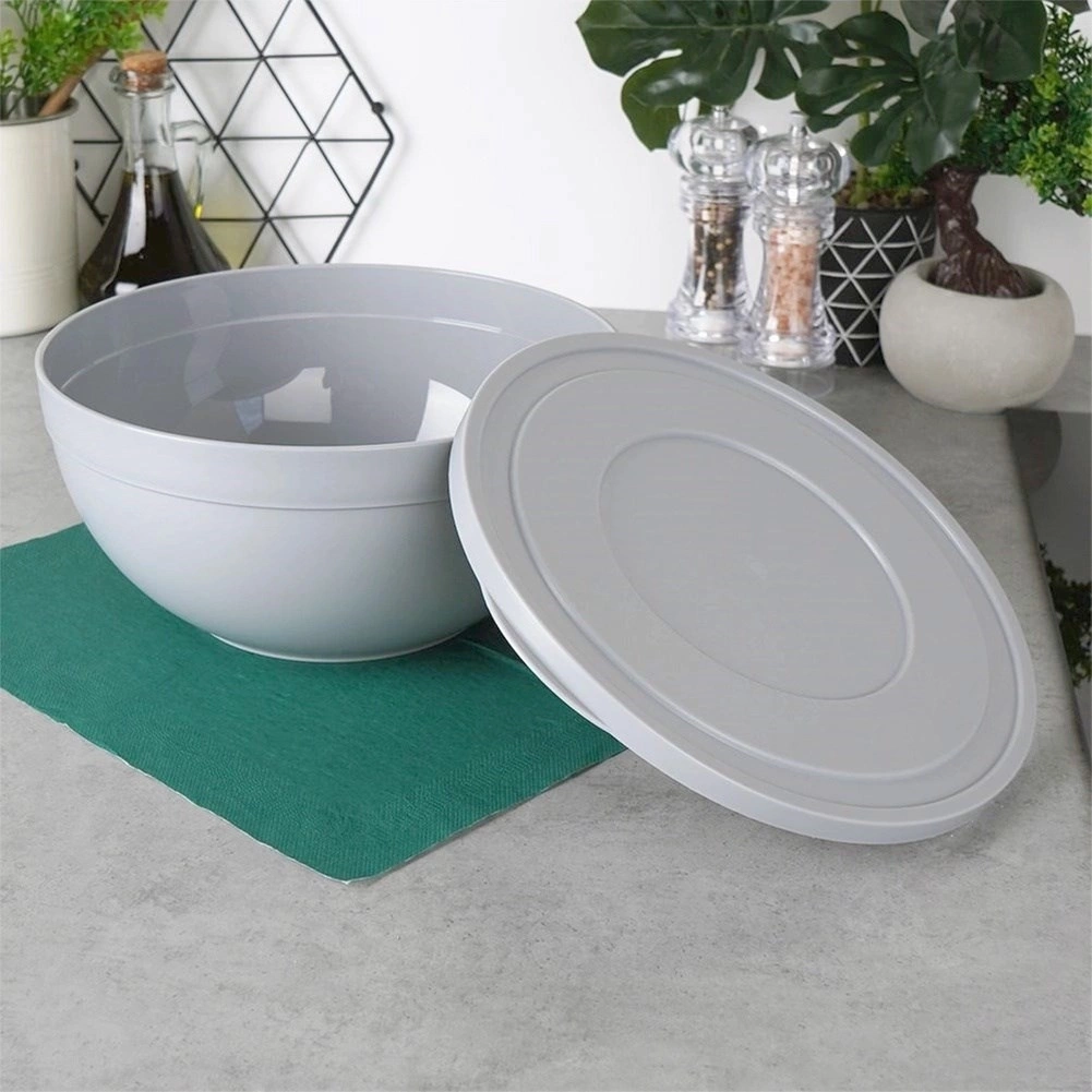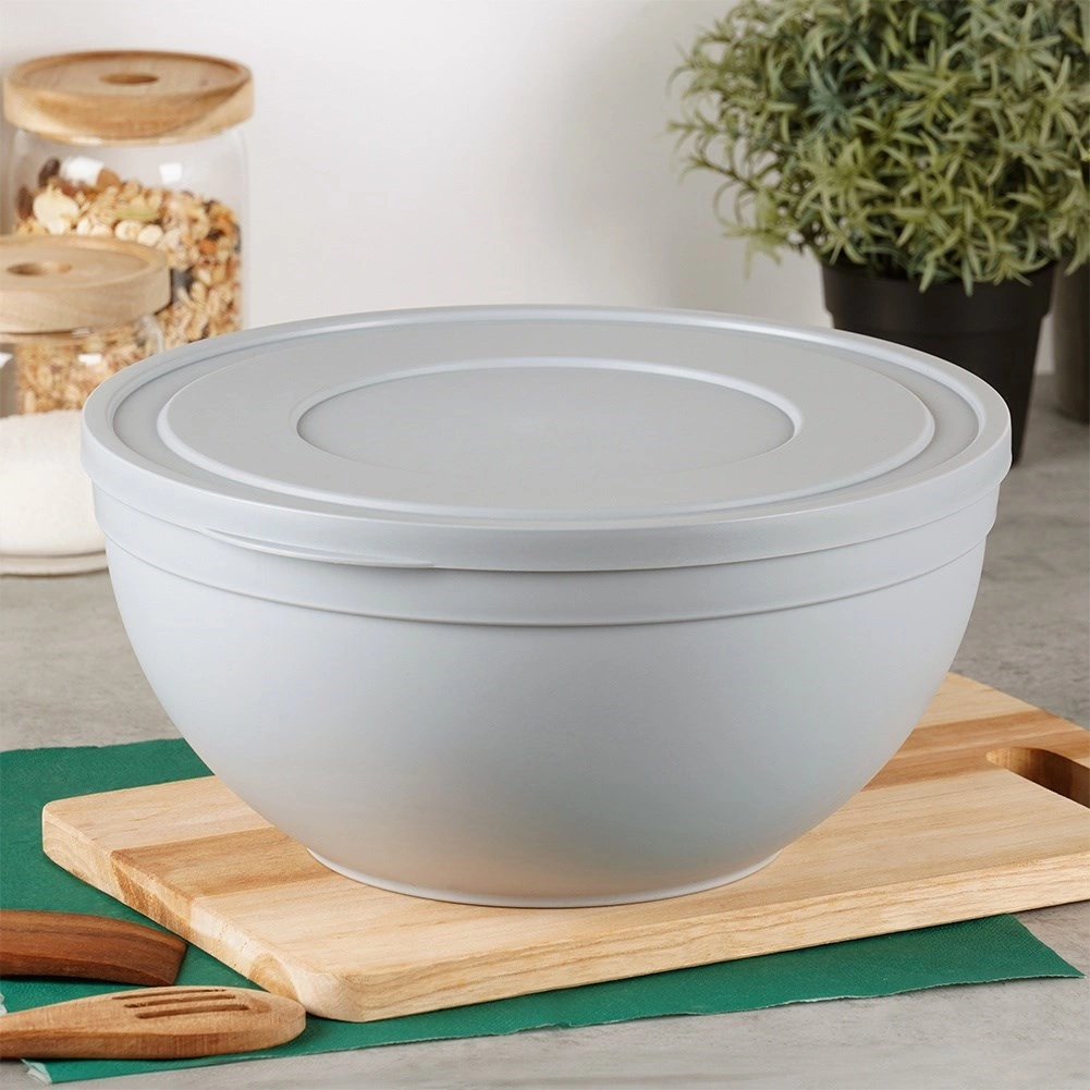Bol de mare capacitate, cu capac solid și etanș, un ajutor excelent pentru copt și gătit zilnic. Datorită volumului de 6 litri, pregătiți comod aluat pentru plăcinte, pâine și pizza. Pereții netezi facilitează amestecarea și curățarea, iar capacul asigură prospețimea și depozitarea în siguranță în frigider.