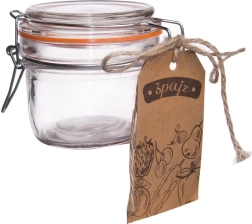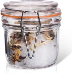 Borcanul universal din sticlă, cu închidere practică tip clemă, protejează conținutul împotriva umidității și impurităților. Garnitura din cauciuc, de culoare portocalie, asigură o etanșeitate perfectă, fiind ideal pentru condimente, amestecuri uscate, nuci măcinate sau fructe mici precum merișoare, afine și zmeură.