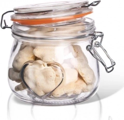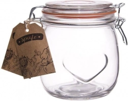 Cutia/borcașul din sticlă cu clips, stilat și practic, este o alegere excelentă pentru depozitarea zilnică a alimentelor și pentru prepararea delicatese-lor de casă. Datorită închiderii cu clips și garnitură de cauciuc, este perfect etanș și protejează conținutul de aer și umezeală. Sticla groasă cu relief în formă de inimă are un aspect elegant, fiind potrivită și ca ambalaj cadou pentru gemuri sau miere de casă.