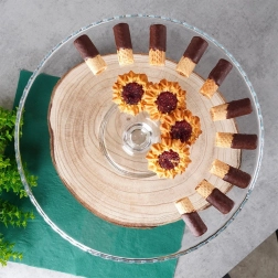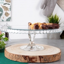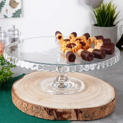 Expuneți torturi, tarte, brioșe sau canapele cu stil. Sticla transparentă a platoului pune în valoare culorile și texturile deserturilor, în timp ce piciorul pedestal înălțat asigură tăiere și servire confortabile. Marginea ondulată adaugă o notă decorativă oricărei mese.