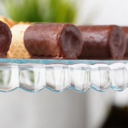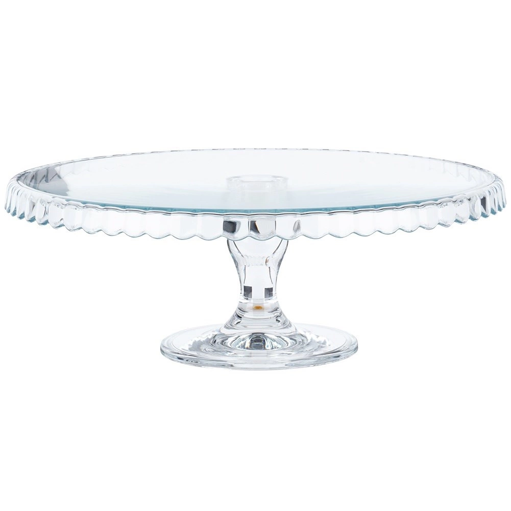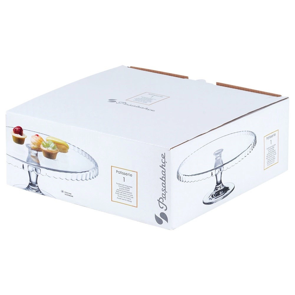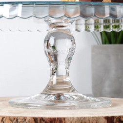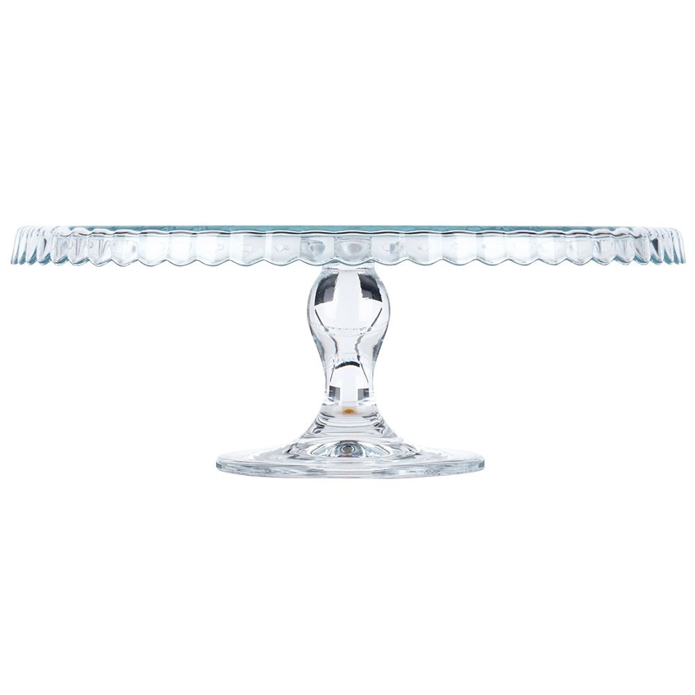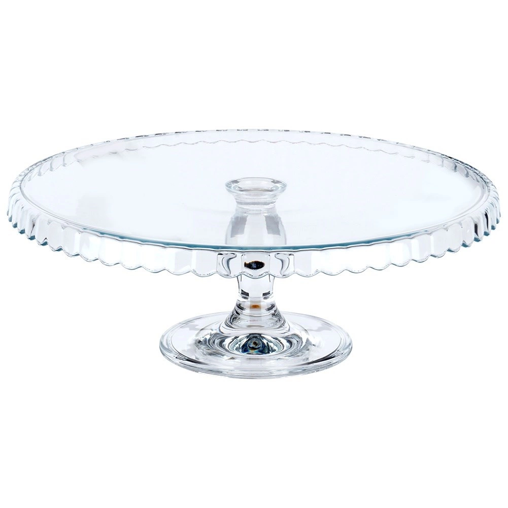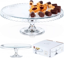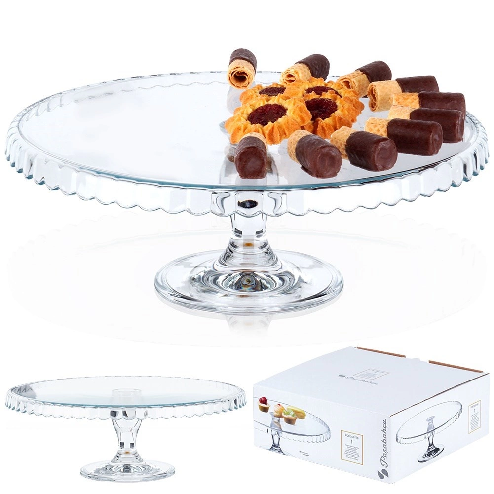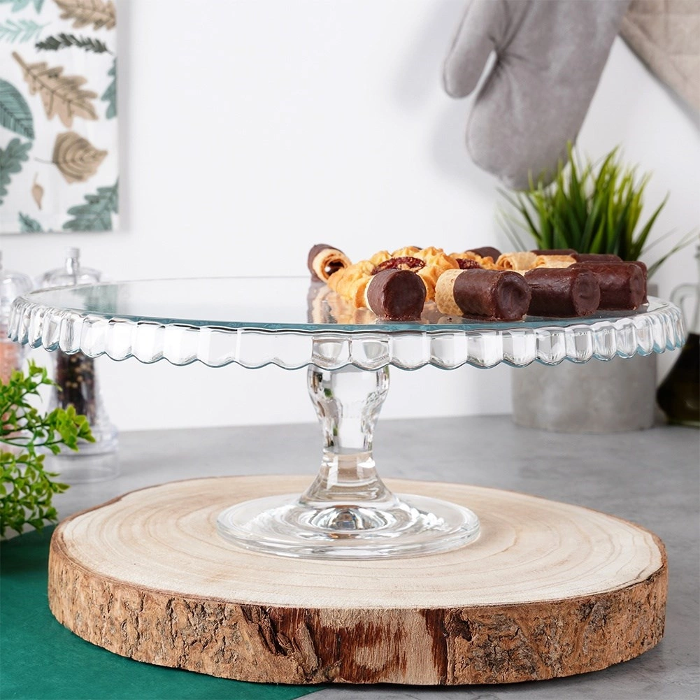 Sticla clară și marginea ondulată accentuează aspectul torturilor și prăjiturilor, care vor străluci la propriu pe masă.