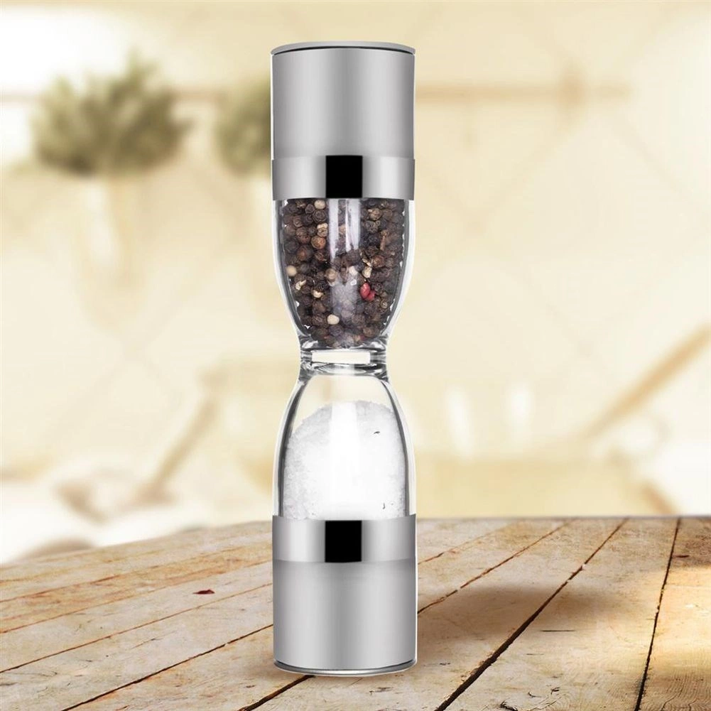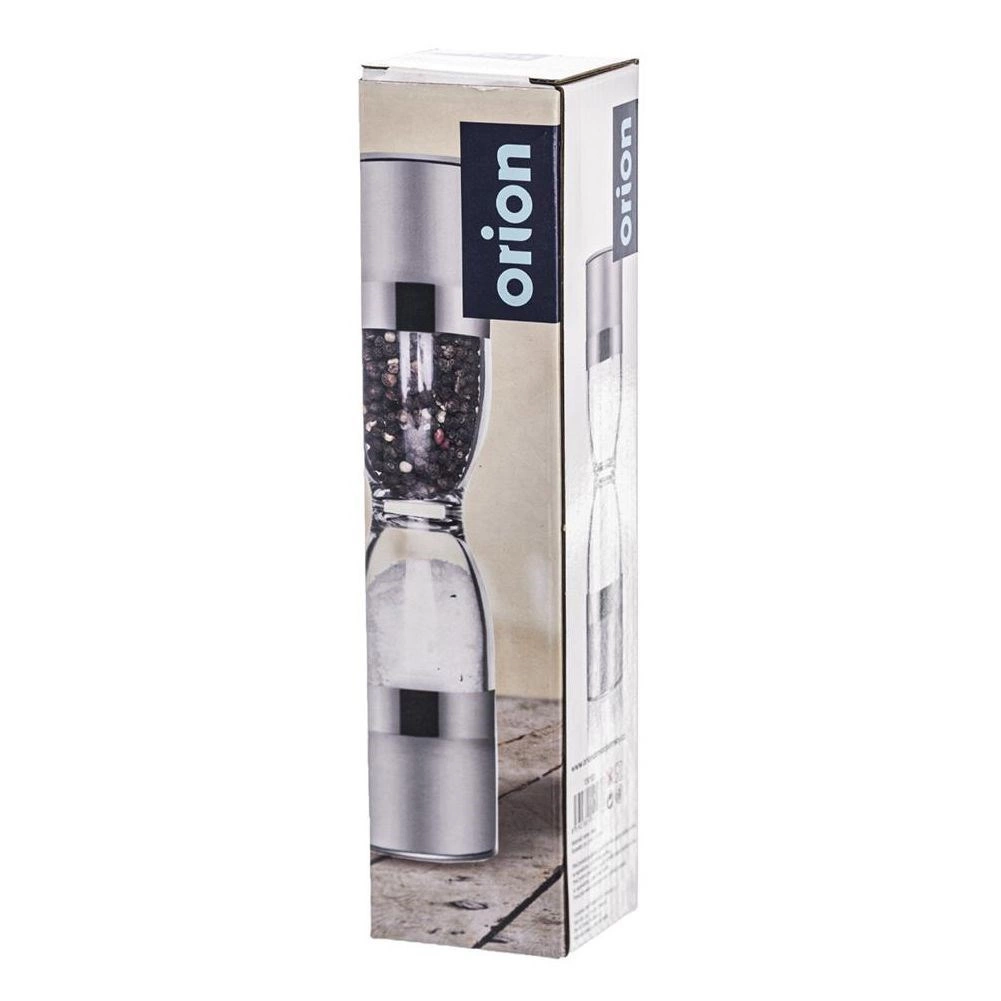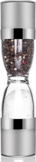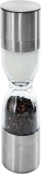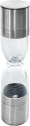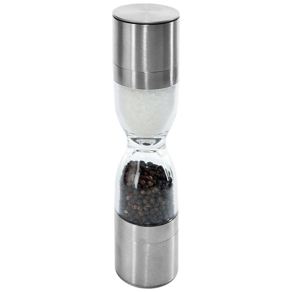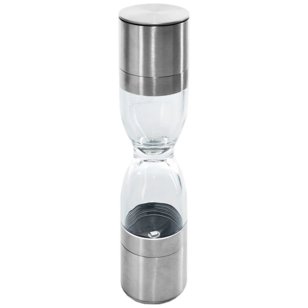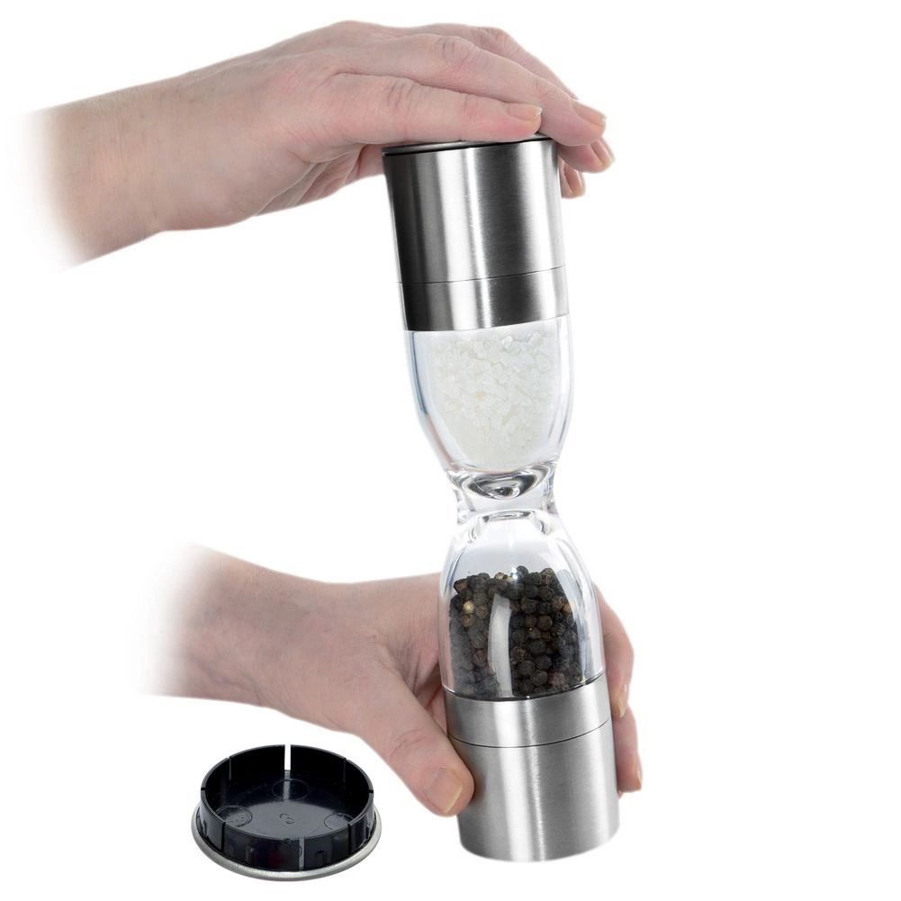 Râșnița dublă elegantă, în forma unei clepsidre, combină oțel inoxidabil, rezervoare transparente și mecanisme ceramice de măcinare pentru o măcinare precisă a sării și piperului. Oferă granulație reglabilă, două camere separate și capace de protecție împotriva căderii resturilor. Un ajutor grozav în orice bucătărie și un accesoriu stilat pentru masă.