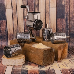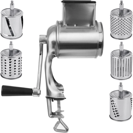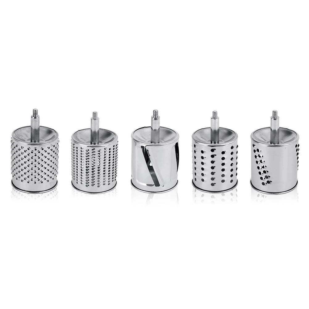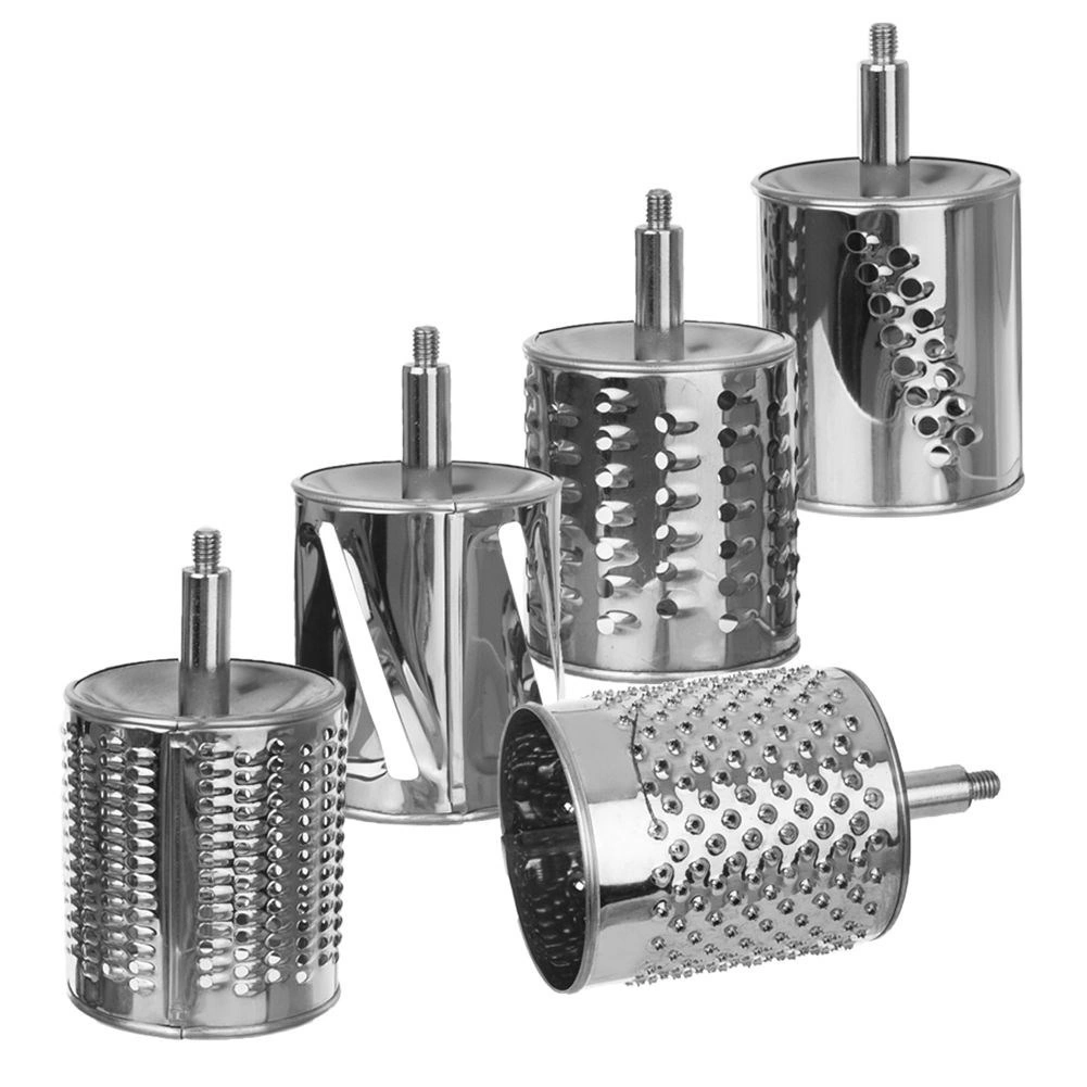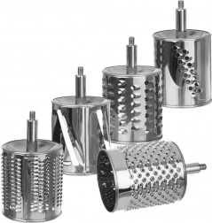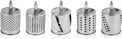 Setul de 5 tobe din oțel inoxidabil acoperă răzuirea fină și grosieră, felierea și mărunțirea. Ideal pentru brânză, nuci, ciocolată, legume și fructe.