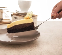 Lama subțire, triunghiulară, alunecă ușor sub porție și păstrează forma desertului la transfer. Ideală pentru torturi și tarte.