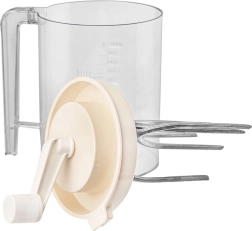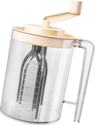 Mixer manual practic cu manivelă și cană gradată integrată de 1,5 l pentru batere, amestecare și preparare de aluaturi cu ușurință. Datorită recipientului transparent cu scală precisă în ml și litri, mânerului solid și capacului anti-stropire, veți pregăti rapid și curat frișcă, bezea din albușuri, aluat pentru clătite și sosuri. Acționarea mecanică fără electricitate, materialele rezistente și întreținerea ușoară fac din acest mixer un ajutor de încredere pentru orice bucătărie.