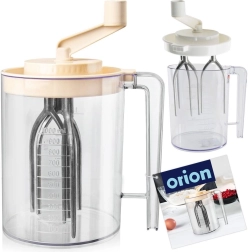 Mixerul manual ORION combină telul, batătorul și cana gradată într-un singur produs. Recipientul transparent cu scală (100–1000 ml și 1/4, 1/2, 3/4, 1 l) facilitează dozarea precisă a ingredientelor. Manivela mecanică pune în mișcare telurile interne, astfel încât amestecați eficient, fără electricitate și fără stropire datorită capacului închis.