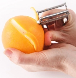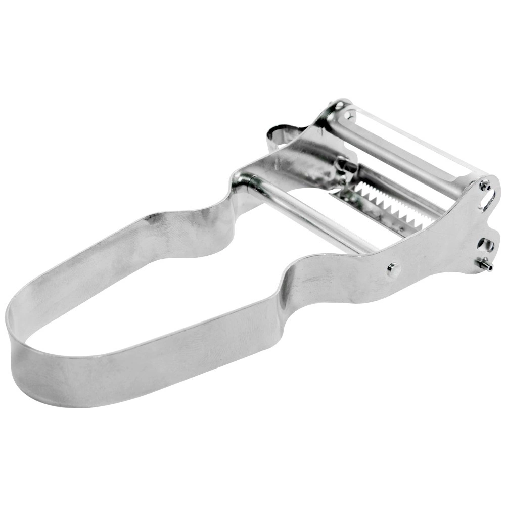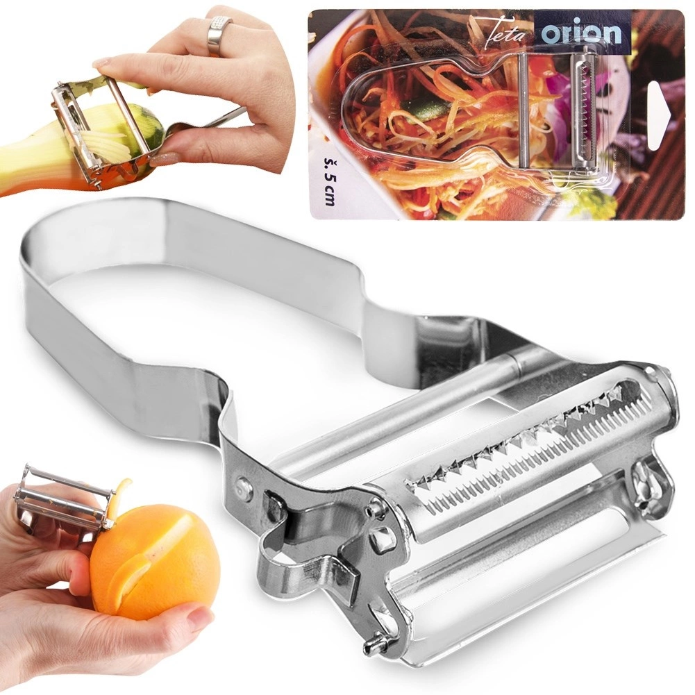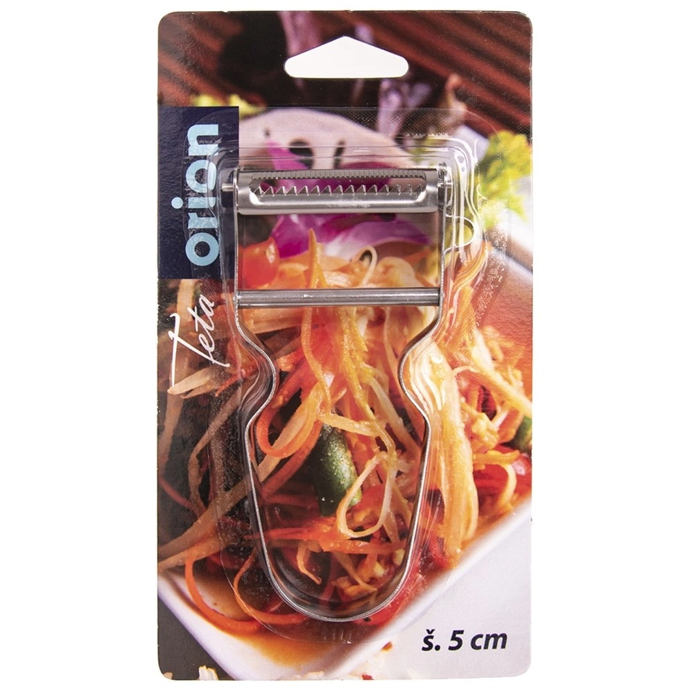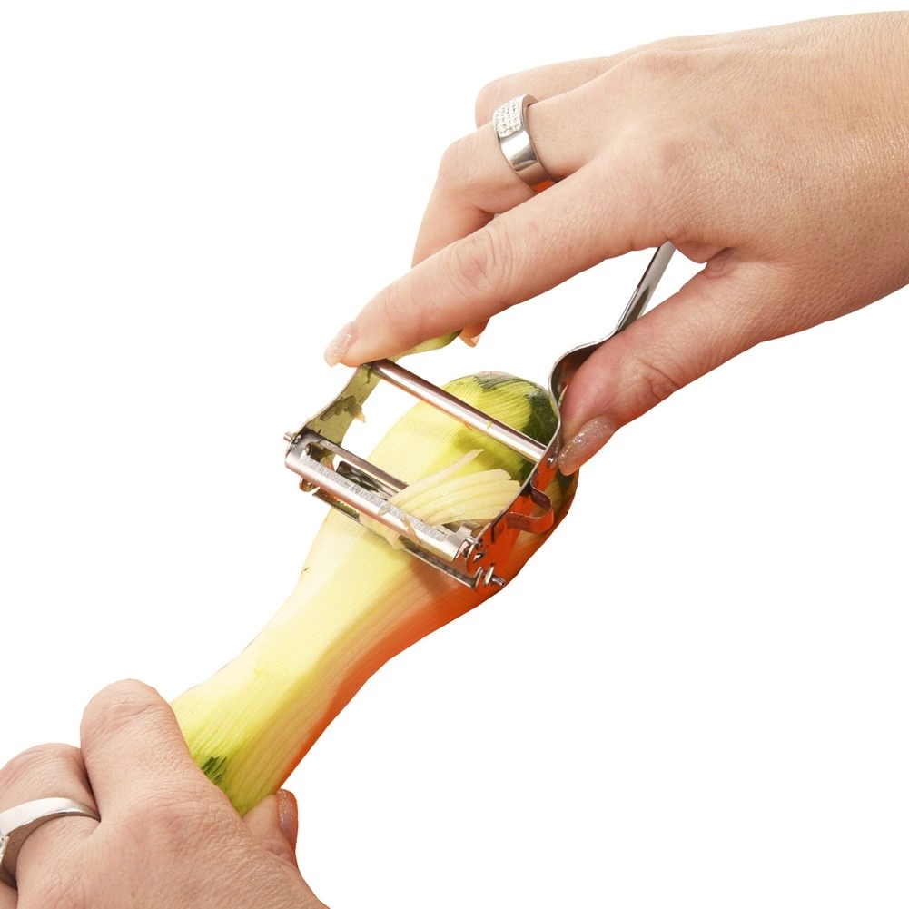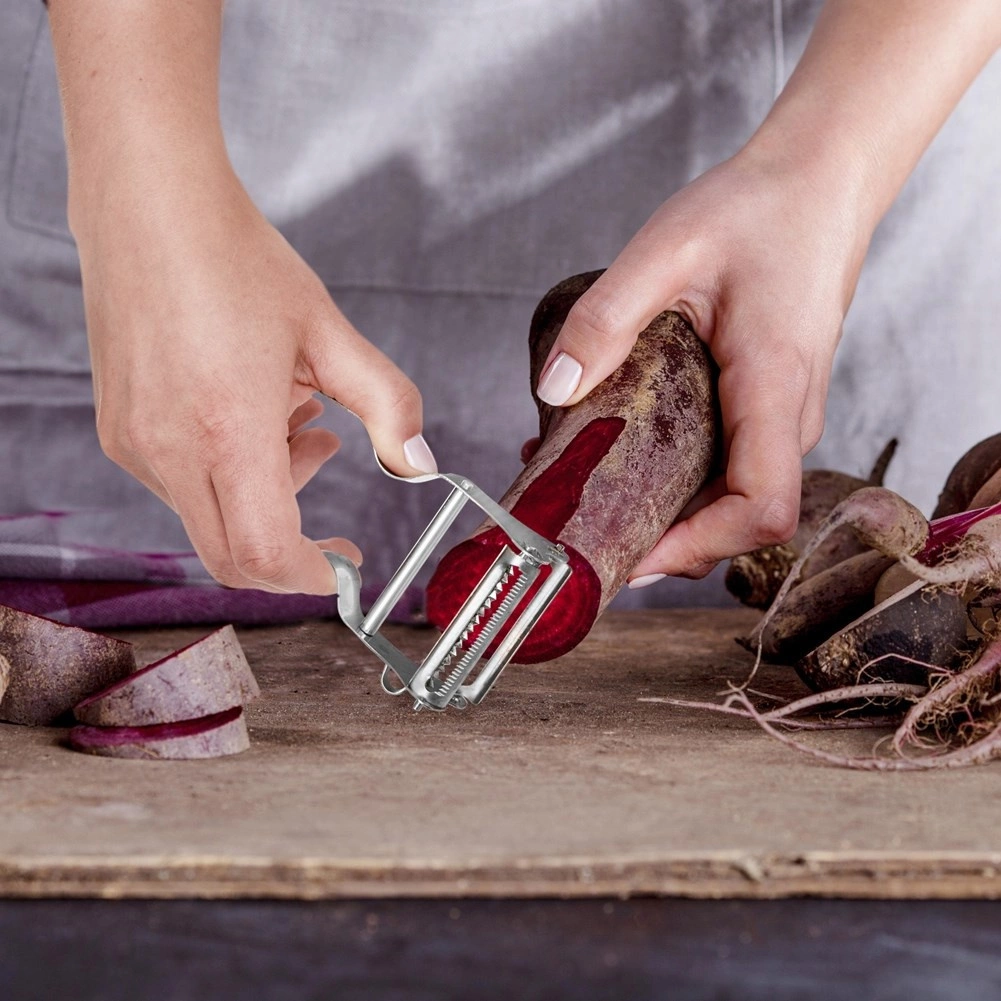 Acest curățător compact din oțel inoxidabil de înaltă calitate gestionează cu ușurință pregătirea zilnică a alimentelor. Cele două lame rotative permit curățarea fină clasică a cartofilor, merelor sau morcovilor, precum și realizarea fâșiilor julienne longitudinale din dovlecel, castravete sau morcov pentru salate și decoruri. Vârful lateral se ocupă de îndepărtarea ochilor și imperfecțiunilor.