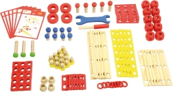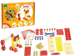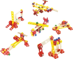 Plăcuțe colorate și naturale, șuruburi, piulițe, roți și conectori le permit copiilor să asambleze vehicule și construcții fanteziste și să le reconstruiască din nou și din nou.