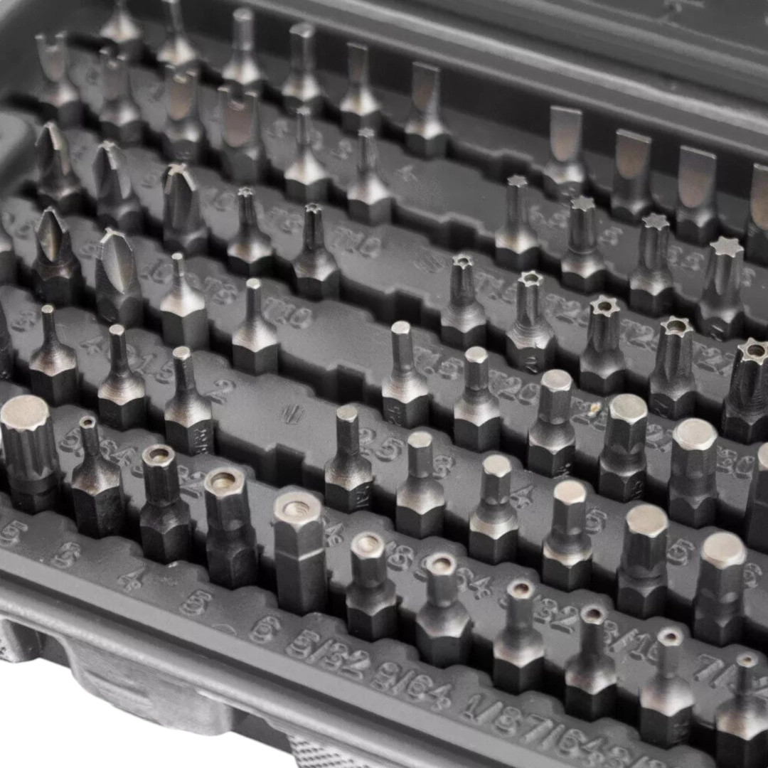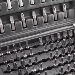 Fiecare bit are locul său dedicat într-o trusă din plastic robust. Găsești ușor dimensiunea potrivită și transporți totul în siguranță.