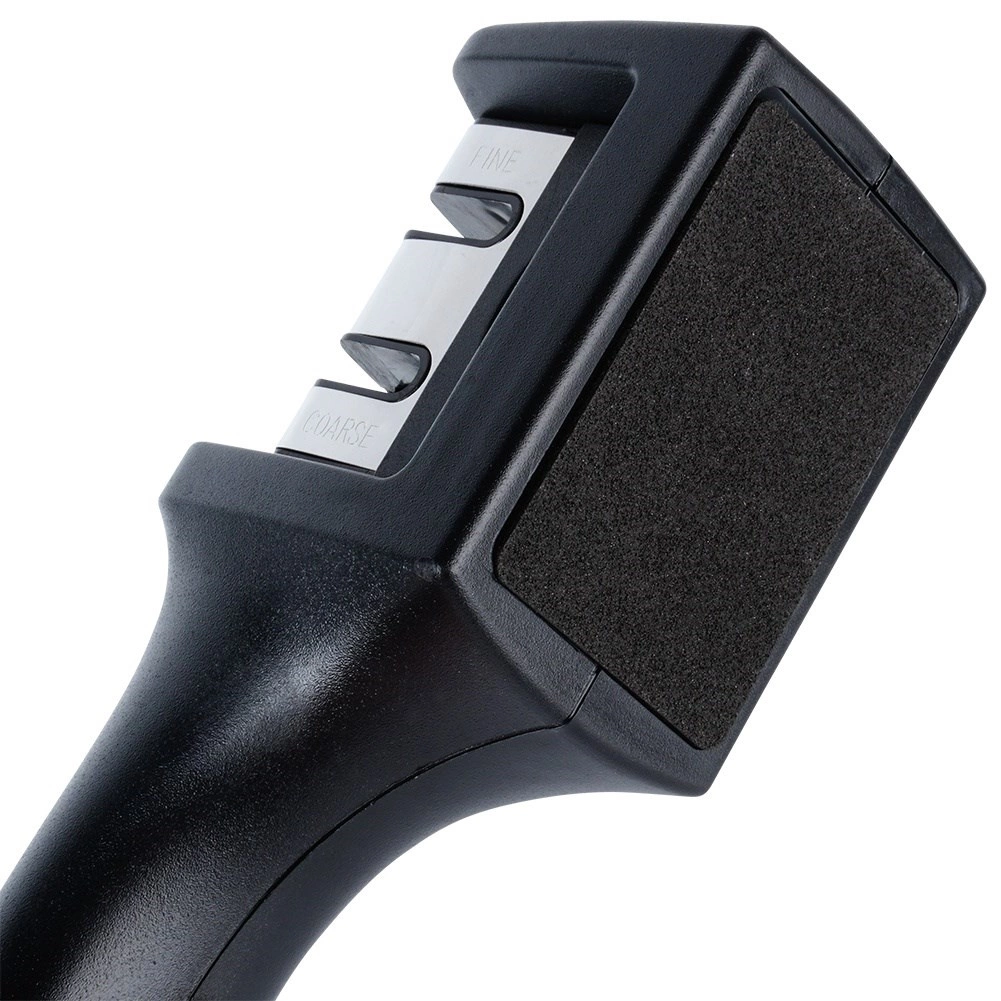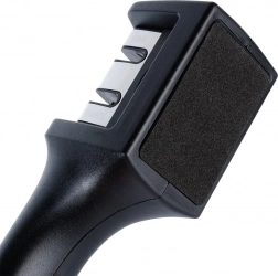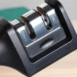 Baza antiderapantă și mânerul ergonomic asigură siguranță la ascuțire fără risc de alunecare.