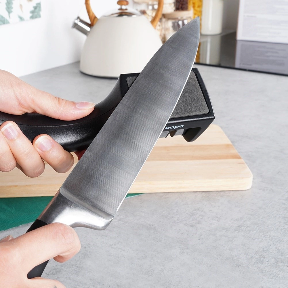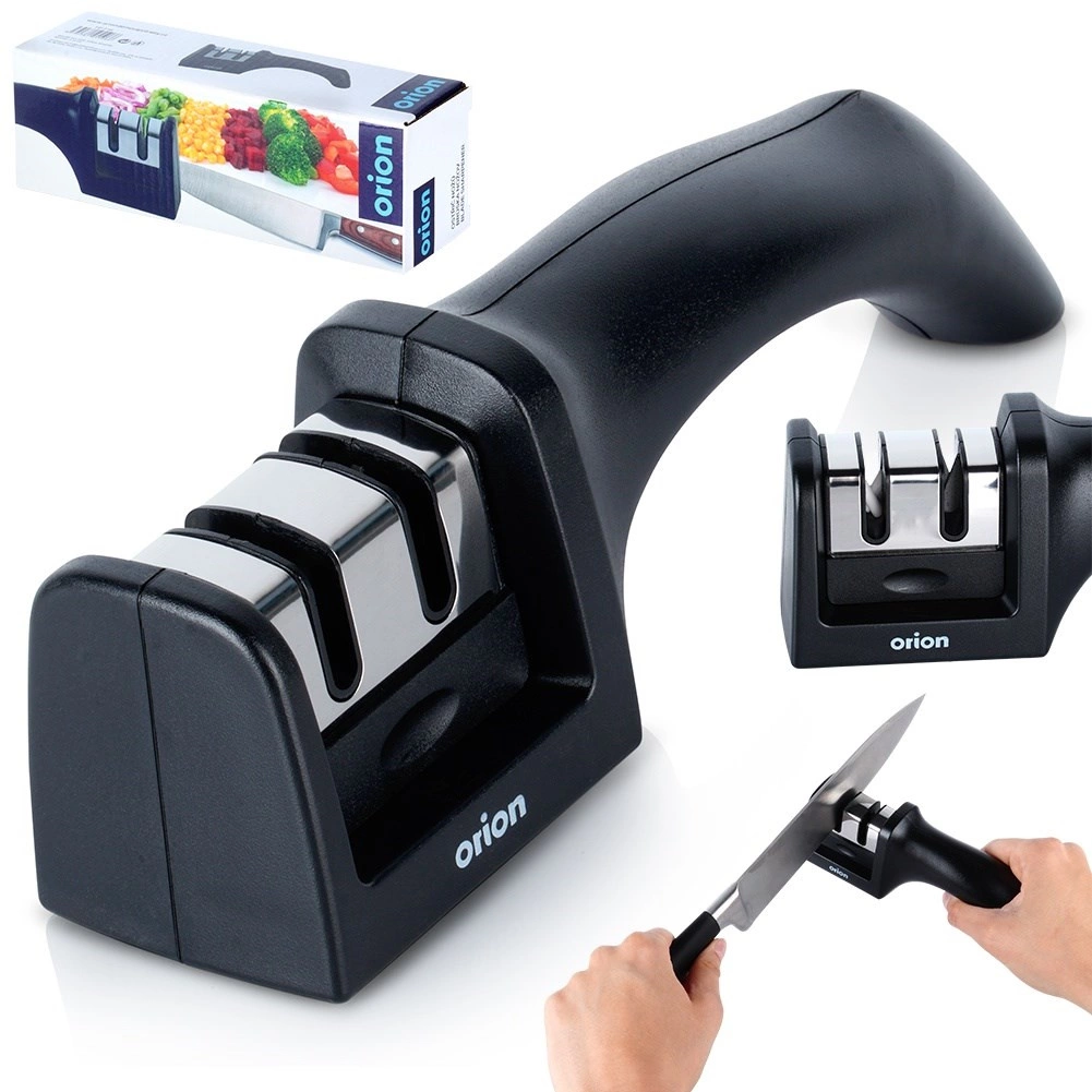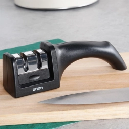 Oferă cuțitelor tale îngrijire precisă cu ascuțitorul în două faze ORION. Prima treaptă, cu cap ceramic din carbură, reface rapid tăișul tocit, iar a doua treaptă, cu inserție ceramică, îl netezește delicat și îl lustruiește pentru o ascuțime de lungă durată. Baza stabilă antiderapantă și mânerul profilat asigură o prindere sigură chiar și la presiune mai mare.