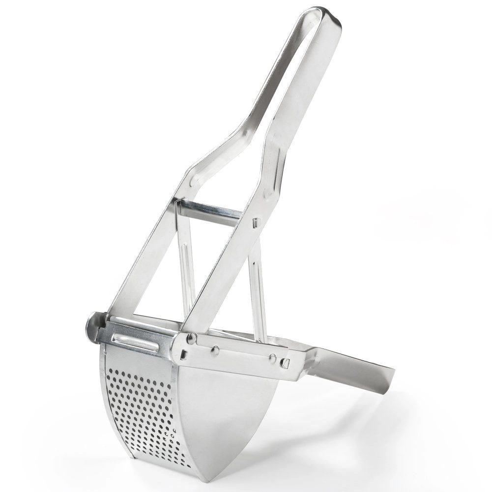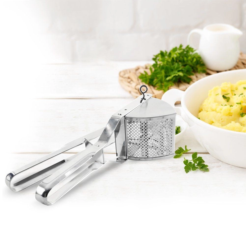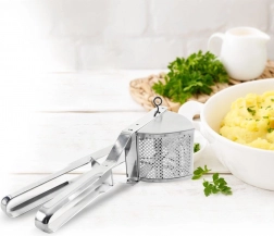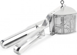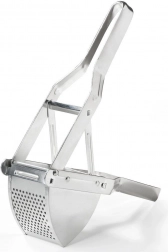 Această presă de cartofi din oțel inoxidabil, rezistentă, împinge fără probleme cartofii fierți, dar și alte legume sau fructe moi. Datorită construcției solide și mânerelor confortabile, este suficient să apeși ușor și în câteva clipe obții o textură fină și aerată fără cocoloașe.