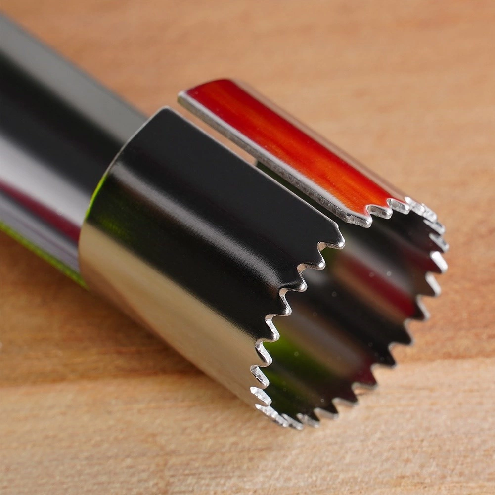 Coroana zimțată pătrunde ușor prin coajă și pulpă și lasă o deschidere netedă, ideală pentru umplere sau decorare.