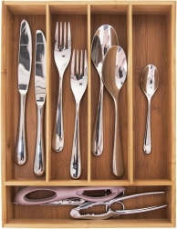 Patru secțiuni înguste pentru tacâmuri și una mai lată pentru ustensile de bucătărie păstrează totul clar împărțit și ușor accesibil.