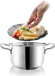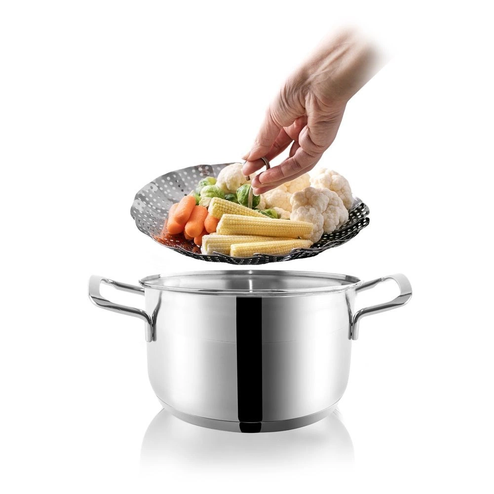 Coșul de abur pliabil din oțel inoxidabil de calitate permite gătirea delicată la abur, prin care alimentele își păstrează gustul, culoarea și nutrienții. Diametrul reglabil 14–23 cm asigură compatibilitate cu oale de dimensiuni diferite, astfel încât pregătiți totul, de la legume și pește până la găluște.