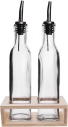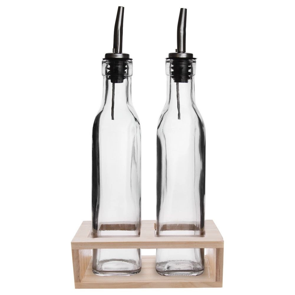 Acest set practic și decorativ include două sticle transparente din sticlă cu dozatoare metalice detașabile și un suport stabil din lemn. Ideal pentru ulei de măsline extravirgin, oțet balsamic sau de vin și alte condimente lichide. Dozatoarele încetinesc debitul pentru o asezonare fină a salatelor, pastelor și pizzei, fără murdărie.