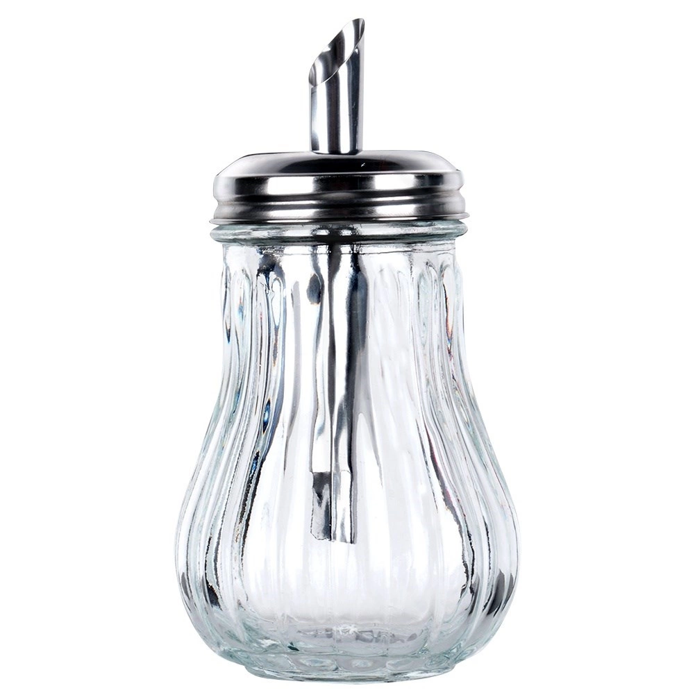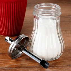 Această zahărniță din sticlă cu dozator practic permite îndulcire rapidă și curată a cafelei, ceaiului și deserturilor. O singură înclinare echivalează cu aproximativ o linguriță, astfel încât dozezi mereu aceeași cantitate. Sticla transparentă oferă o vedere imediată asupra nivelului conținutului, iar capacul din inox cu gura înclinată asigură turnare precisă și controlată, fără împrăștiere.