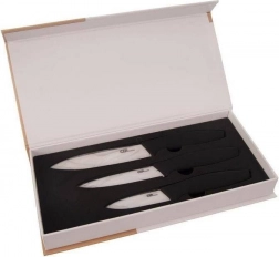 Acest set universal include un cuțit mic, mediu și mare pentru tăiere precisă, porționare și curățare. Lama integral ceramică oferă o tăietură netedă, alimentele se lipesc mai puțin și își păstrează mai bine vitaminele și valorile nutritive. Datorită mînerelor ergonomice din plastic de calitate, negre, cuțitele se țin confortabil și nu alunecă în mână.