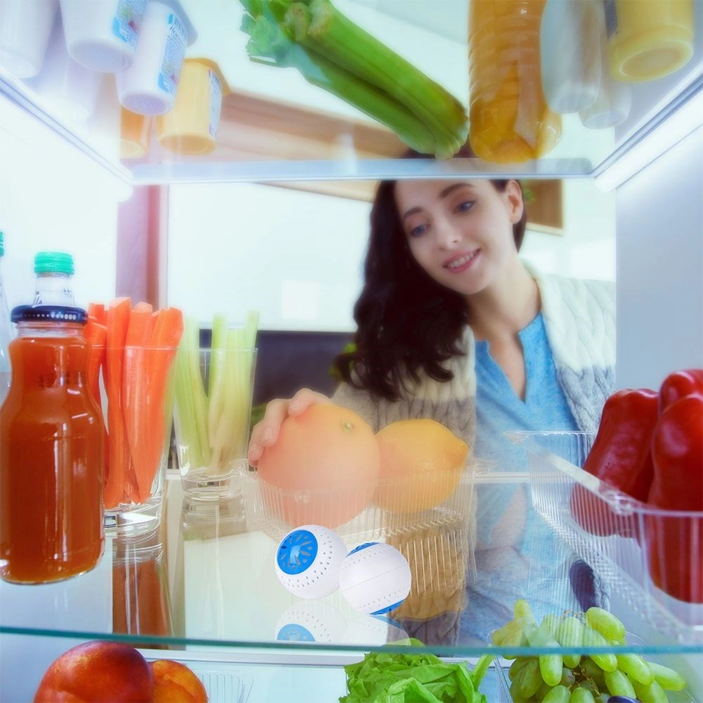 Forma sferică, cu diametrul de 5 cm, economisește spațiu. Puteți așeza absorbantele liber pe raft, în ușă sau în sertarul pentru legume.
