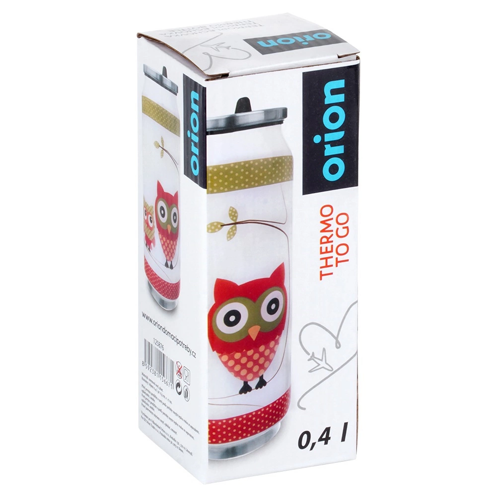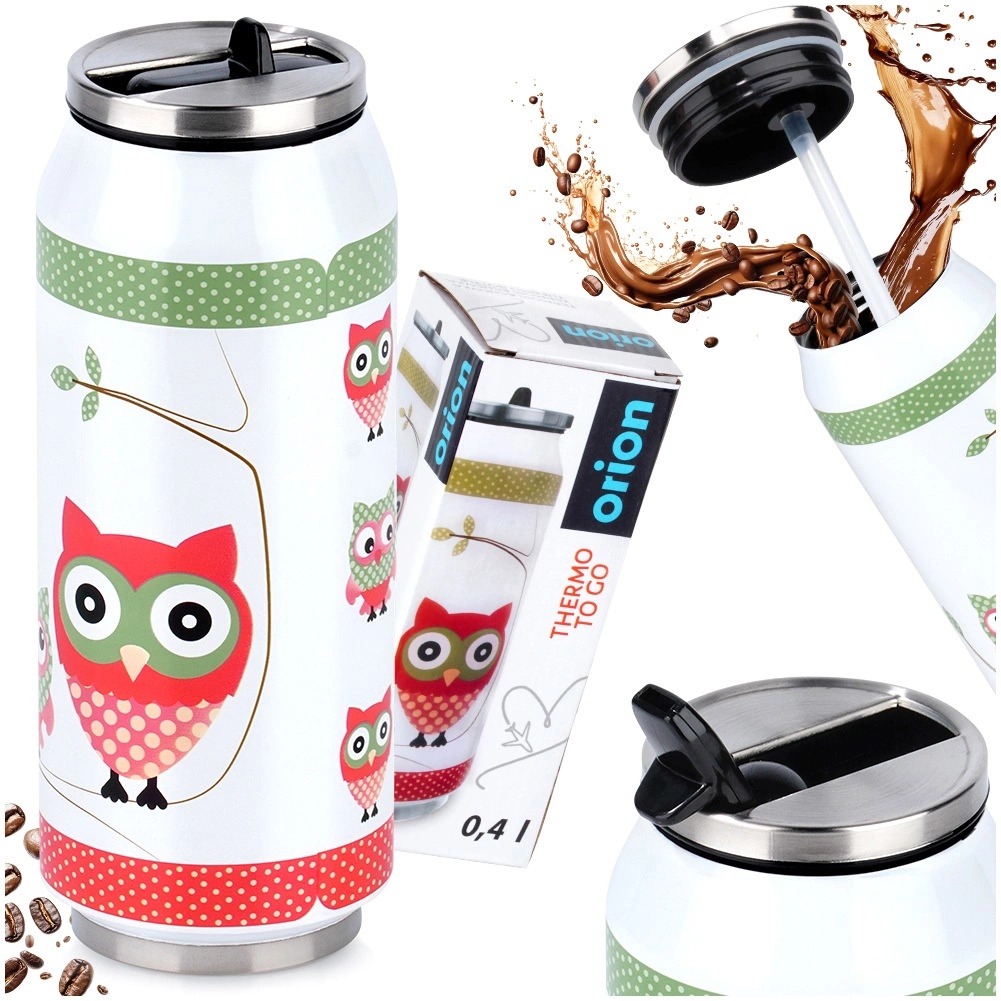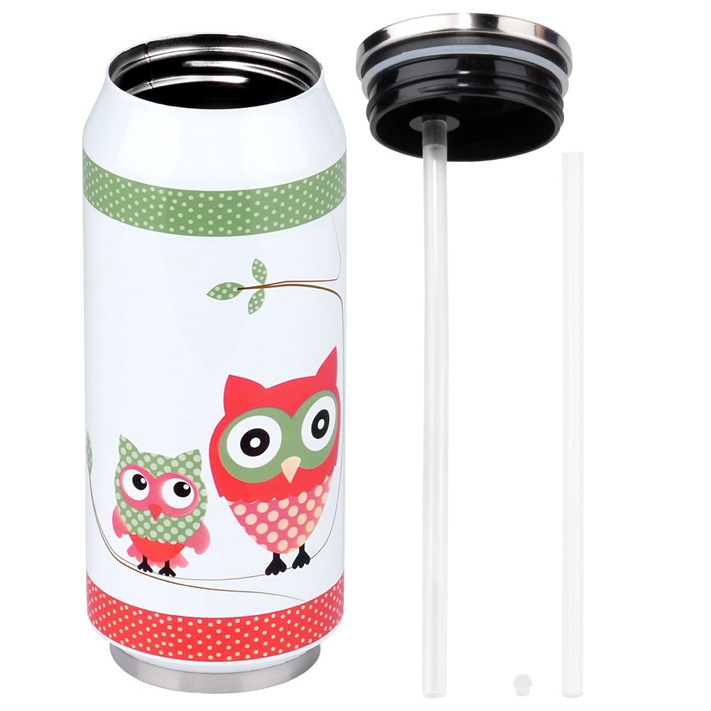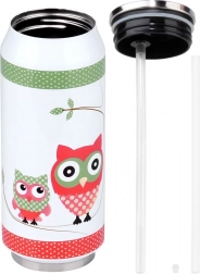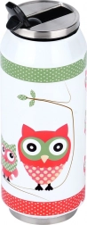 Corp din oțel inoxidabil de calitate, la interior și exterior, capac înfiletabil cu garnitură de etanșare și design practic în formă de doză, cu motiv de bufniță.