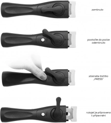 Mânerul se atașează ușor în timpul gătirii și se îndepărtează după terminare. Tigăile pot fi apoi puse cu ușurință în cuptor, în frigider și stocate una în alta pentru economisirea spațiului.
