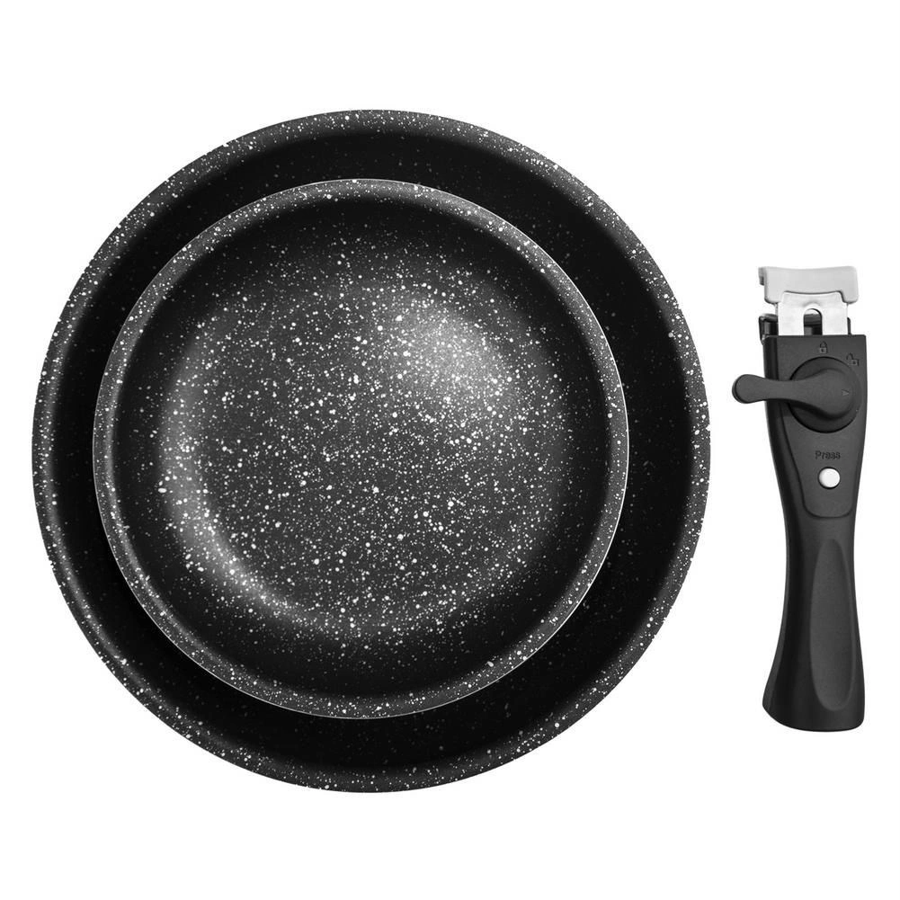 Setul GRANDE COMBI oferă două tigăi universale (20 și 26 cm) cu mâner detașabil, care pot fi ușor introduse una în alta pentru a economisi spațiu în dulapuri. Finisajul granit cu efect de piatră este foarte antiaderent, durabil și permite o preparare mai sănătoasă a mâncării cu minim de ulei.