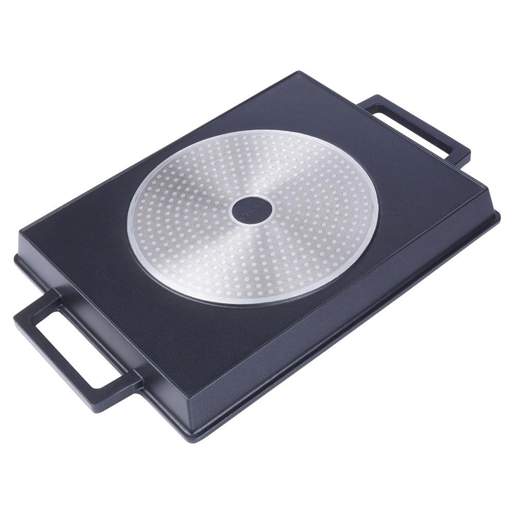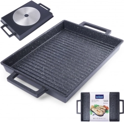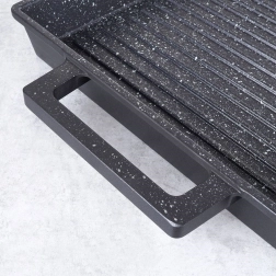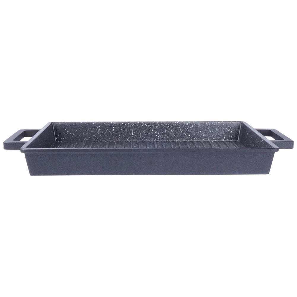 Placă de grătar universală din aluminiu, cu strat antiaderent de granit PFLUON GRANIT de înaltă calitate, asigură distribuție rapidă și uniformă a căldurii. Marginile înalte și mânerele laterale late ușurează manevrarea, iar suprafața striată creează un aspect grilat atrăgător și evacuează excesul de grăsime pentru o preparare mai sănătoasă a alimentelor.