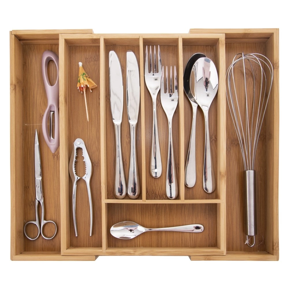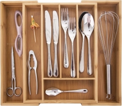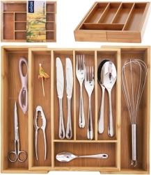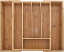 Lemnul de bambus este rezistent la umiditate și deformări, nu absoarbe mirosurile și se curăță ușor. Organizatorul oferă 5 până la 7 compartimente în funcție de lărgirea aleasă, astfel încât poți adapta organizarea internă nevoilor tale – de la furculițe și linguri până la curățătoare, teluri sau foarfeci de bucătărie.