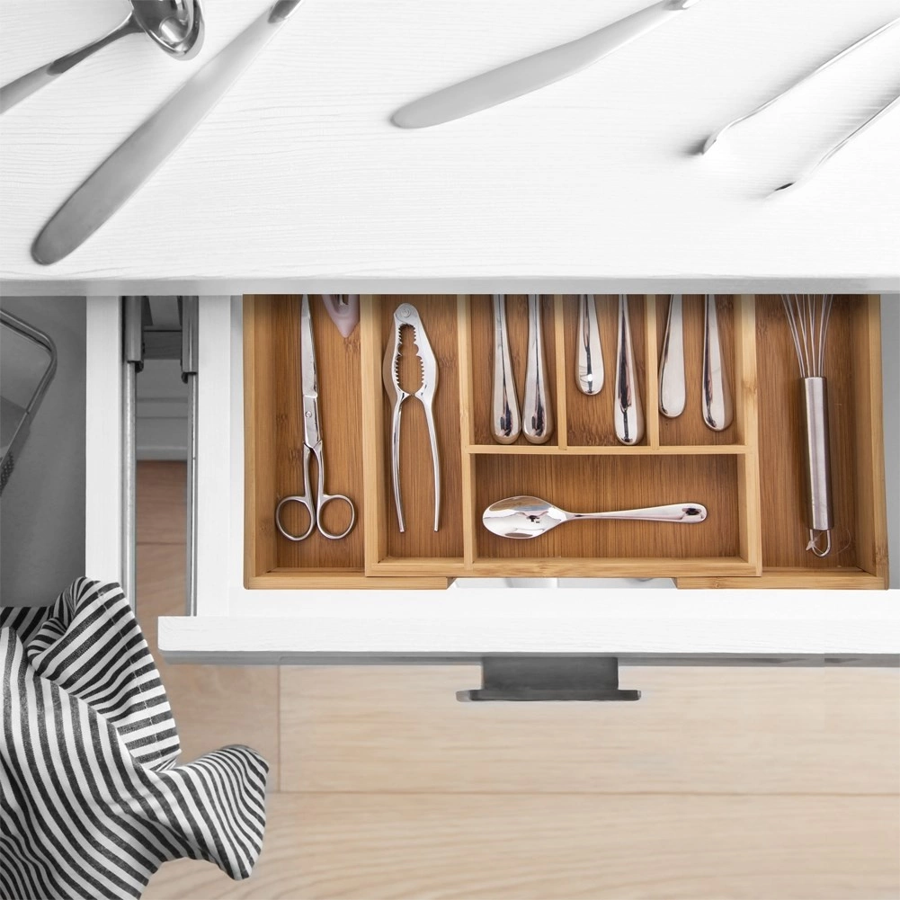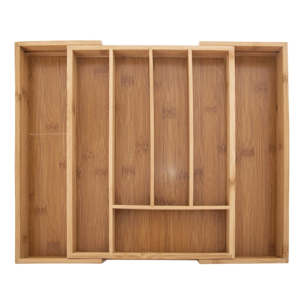 Inserția practică pentru sertar din bambus natural te ajută să sortezi elegant tacâmurile și ustensilele mici de bucătărie. Datorită părților laterale extensibile, folosești ușor fiecare centimetru de spațiu, iar totul rămâne la locul lui – ordonat și mereu la îndemână.