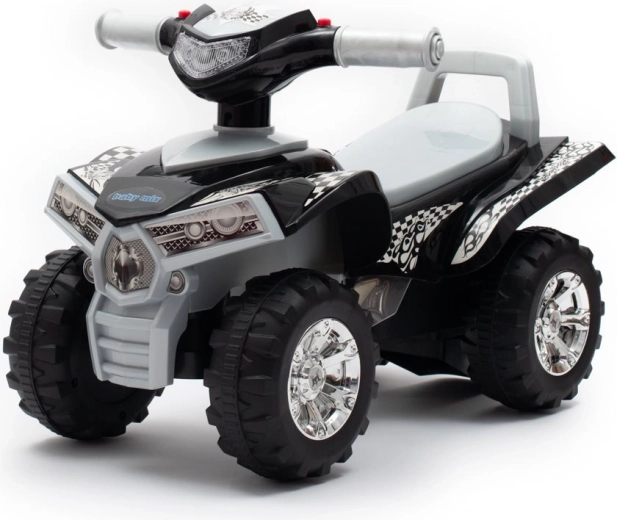 Acest quad de împins BABY MIX în variantă gri este un partener grozav pentru primii pași și plimbări. Oferă un scaun confortabil și lat, o construcție stabilă și un control ușor prin ghidon. Datorită efectelor jucăușe – claxon, trei melodii preînregistrate și lumini clipitoare – copiii se vor bucura de multă distracție și motivație pentru mișcare.