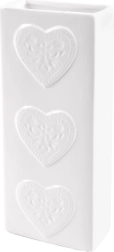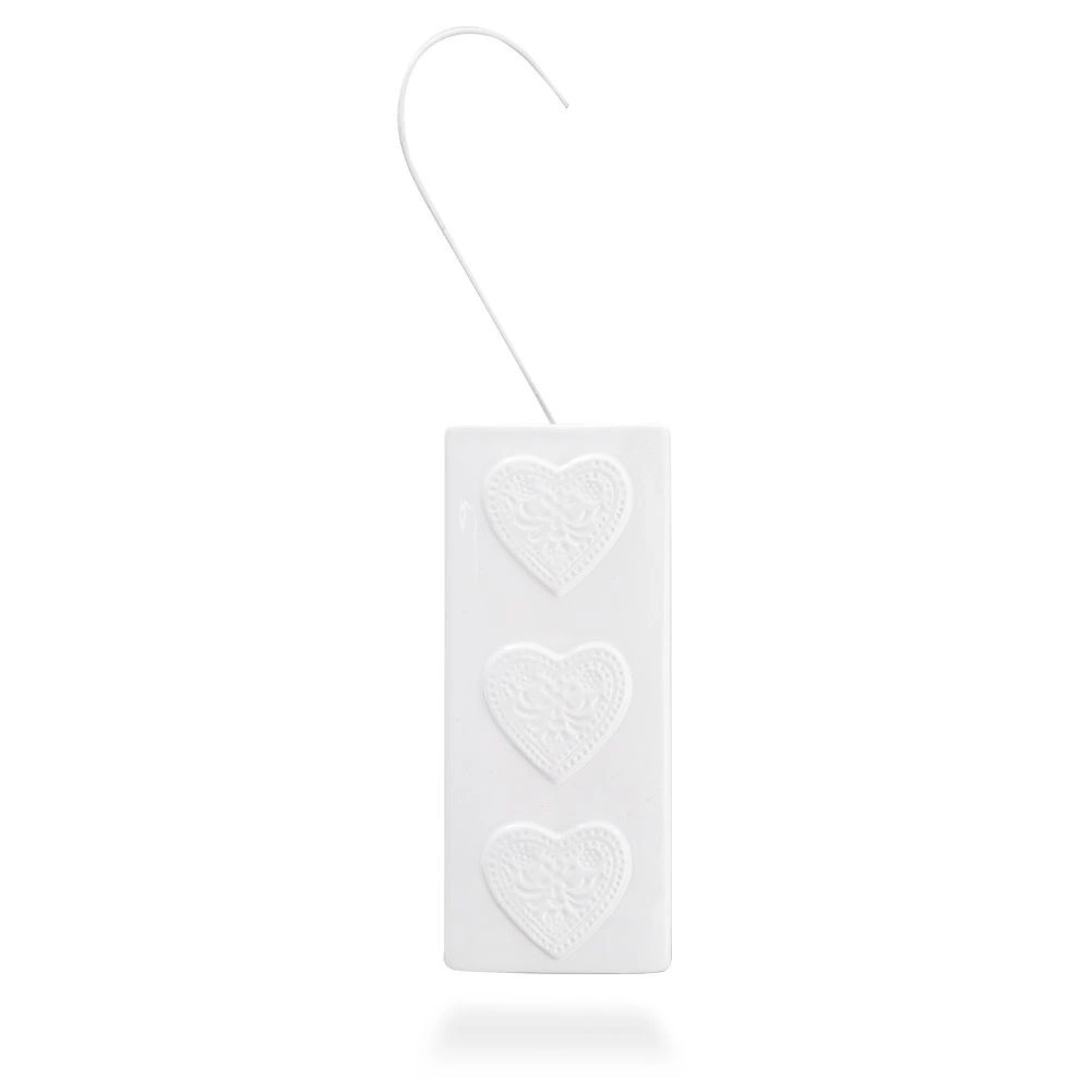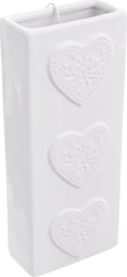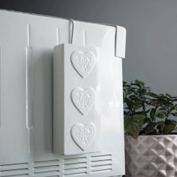 Fabricat din ceramică de calitate, de culoare albă, cu glazură lucioasă și trei inimioare reliefate pe partea frontală. Forma îngustă și înaltă economisește spațiu și permite agățarea comodă pe majoritatea caloriferelor obișnuite, fără unelte.
