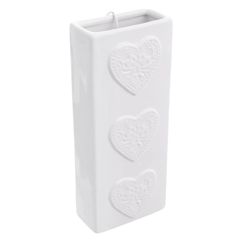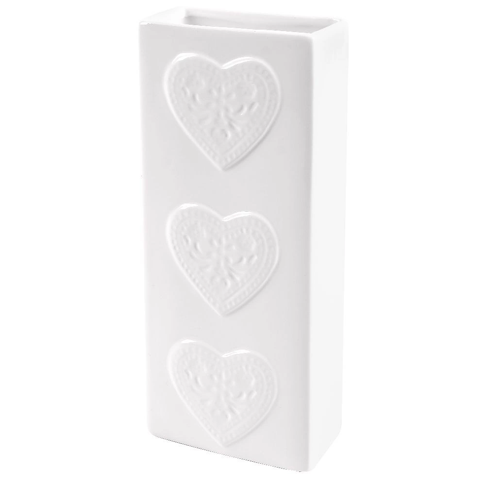Ceramica albă glazurată, cu inimi embosate, are un aspect elegant și se potrivește atât în interioare moderne, cât și clasice.