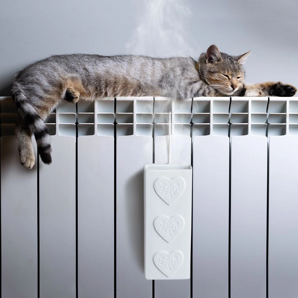 Cârligul metalic permite fixarea rapidă pe majoritatea caloriferelor. Umpleți cu apă și agățați – umidificarea începe imediat odată cu încălzirea caloriferului.