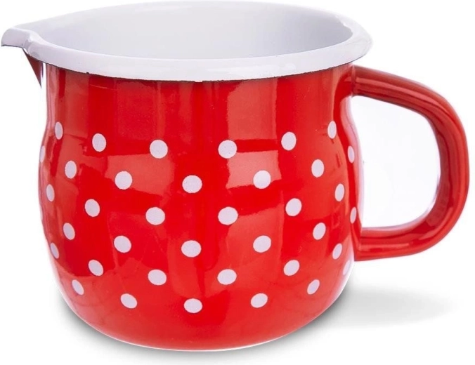 Cană emailată stilată cu cioc, în culoare roșie cu buline albe, cu volum de 800 ml, ideală pentru utilizare zilnică. Datorită oțelului solid și finisajului emailat de calitate, este sigură pentru sănătate, potrivită și pentru alergici și ușor de curățat. Este universală pentru încălzirea și servirea băuturilor, compatibilă cu plite pe gaz, electrice, vitroceramice, cu halogen și cu inducție.