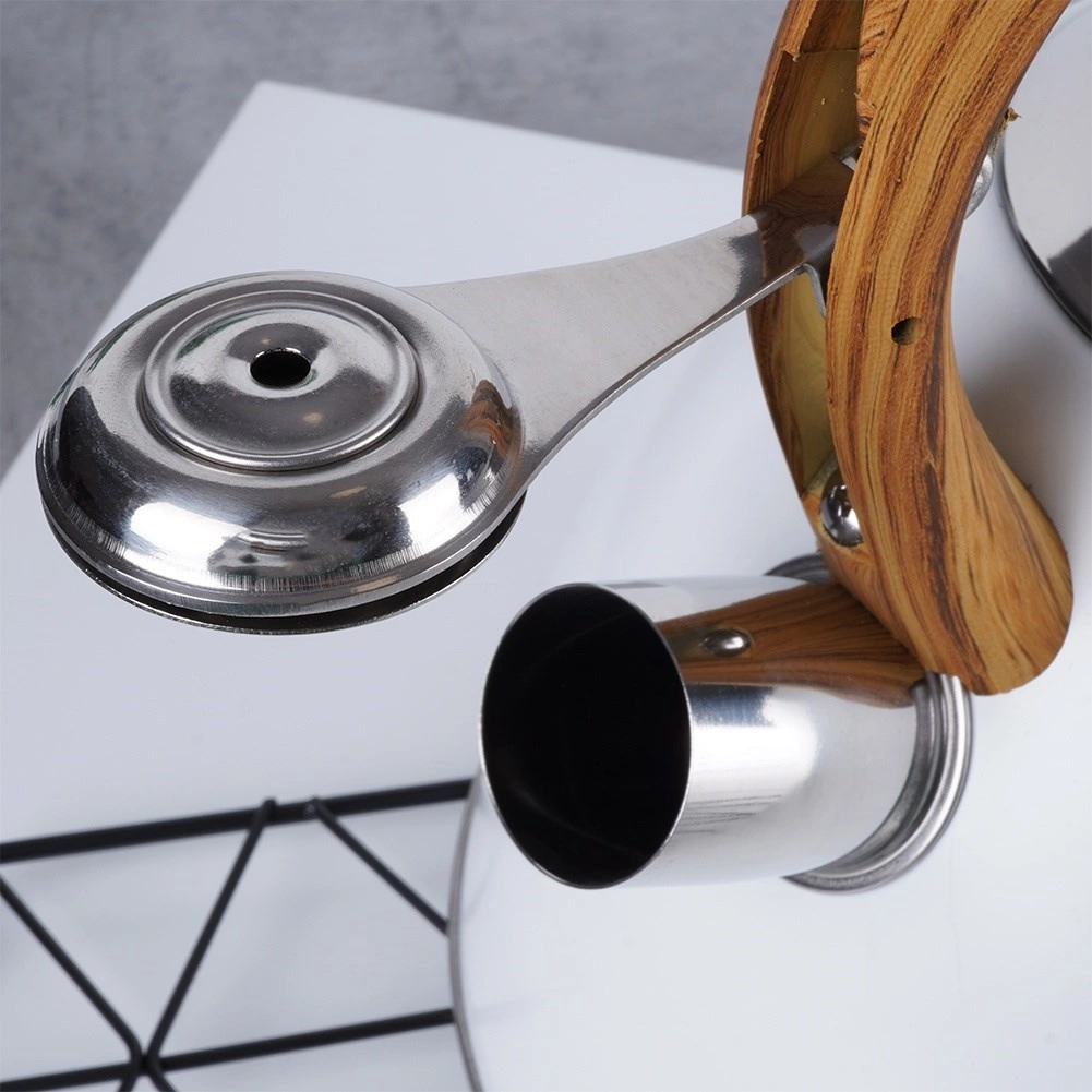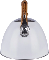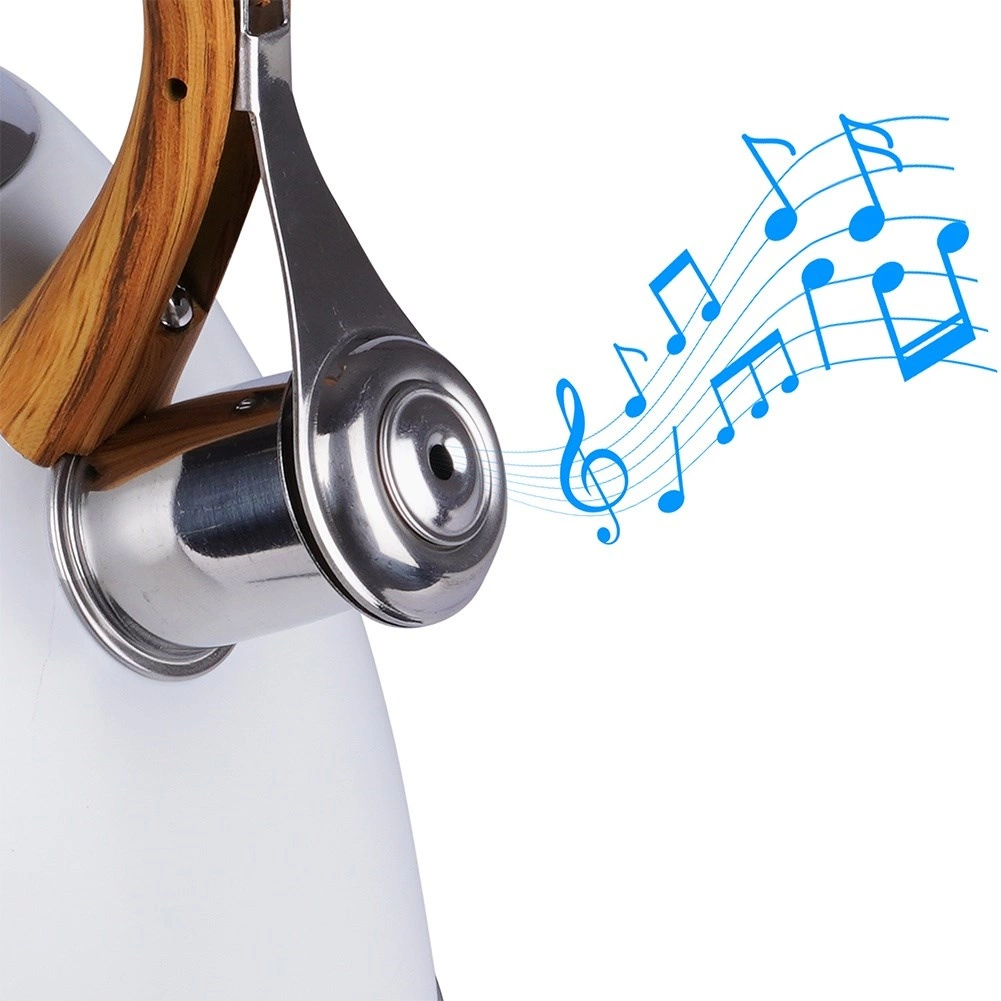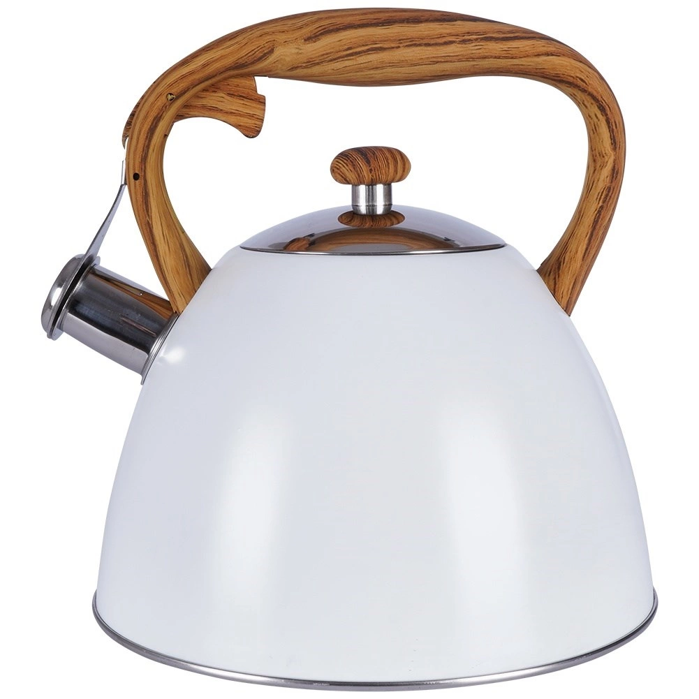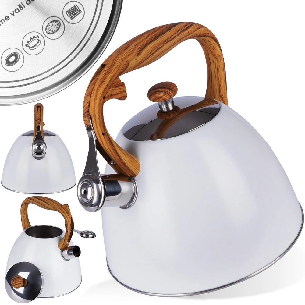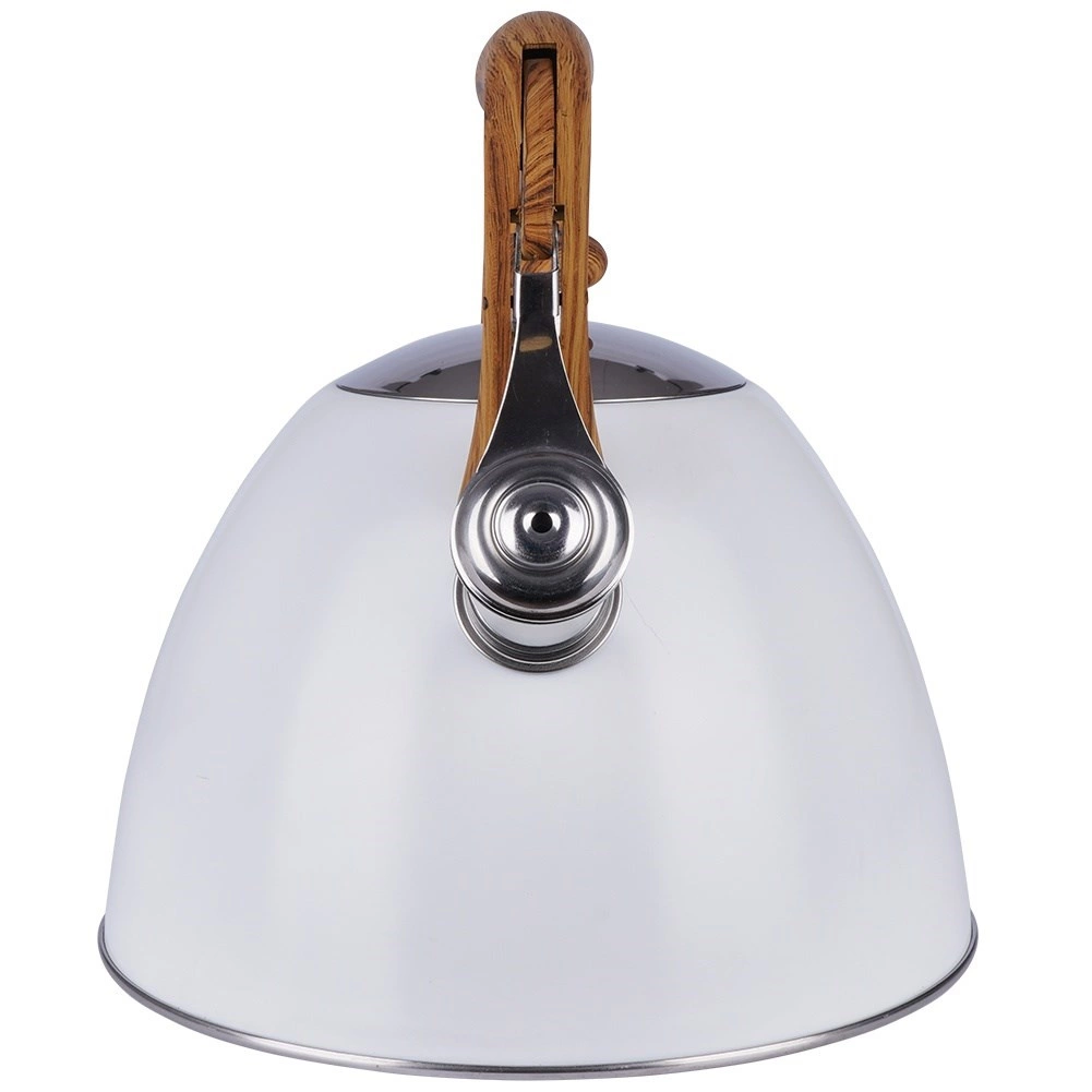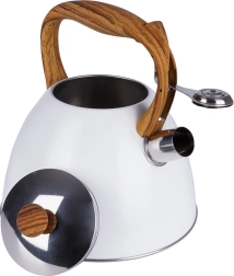 Acest ceainic clasic, cu design curat, combină oțelul inoxidabil rezistent cu un finisaj alb modern și un mâner confortabil cu decor de lemn. Fluierul cu deschidere automată din mâner ușurează turnarea, iar capacul larg permite completarea comodă a apei și curățarea facilă. Datorită materialului de calitate, nu afectează gustul apei și asigură transfer eficient de căldură.