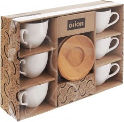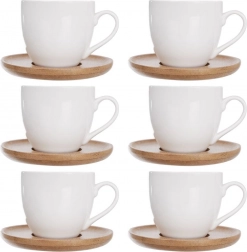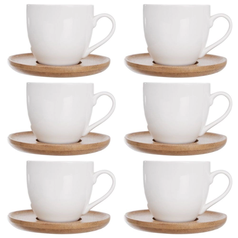 Șase cești albe din porțelan cu farfurioare din lemn alcătuiesc un ansamblu armonios care înfrumusețează orice masă. Ideal pentru barista de acasă sau ca un cadou.