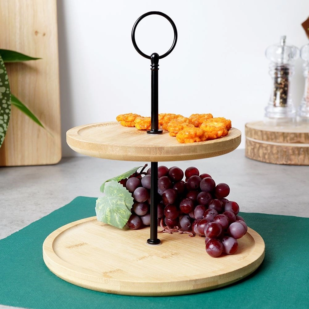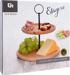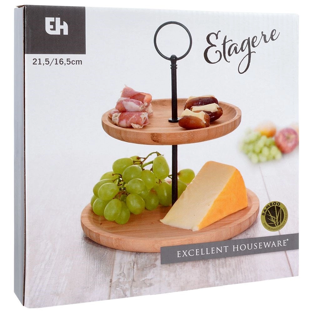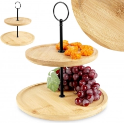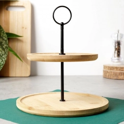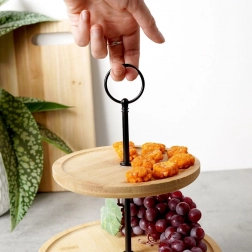 Oferă mesei tale un accesoriu elegant: suport pe două niveluri din bambus natural, cu o construcție metalică robustă în culoare neagră. Este ideal pentru brioșe, biscuiți, mini deserturi, fructe și gustări sărate. Cele două niveluri economisesc spațiul și permit o prezentare atrăgătoare.