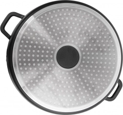 Capacul din sticlă, cu margine din inox și supapă pentru evacuarea aburului, oferă o vedere clară asupra gătirii. Mânerele laterale duble asigură manipulare confortabilă și sigură. Oala este excelentă pentru gătit zilnic, pentru înăbușire și pentru servire direct pe masă.
